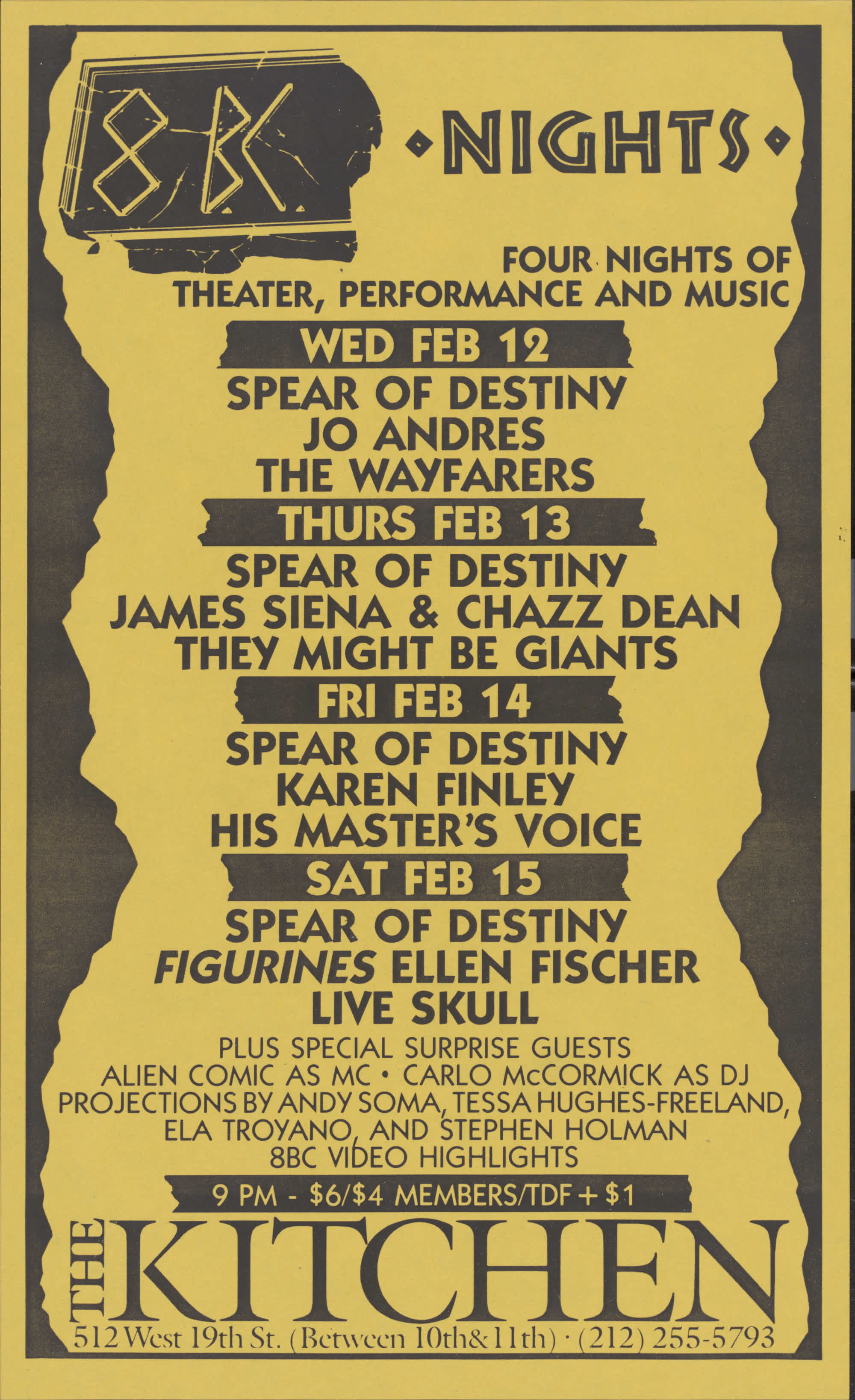 On February 12-15 1986, 8BC Nights: Four Nights of Theater, Performance and Music took place at The Kitchen. This event included performances by Kestutis Nakas, Karen Finley, Jo Andres, Live Skull, The Wayfarers, James Seina & Chazz Dean, Ellen Fischer, Ethyl Eichelberger, They Might be Giants, His Master’s Voice, Alien Comic as MC, and more. 8BC Nights was named after a cabaret called “8BC,” which presented the work of emerging artists to a downtown audience, and existed from 1983–1985 until NYC zoning regulations closed it down.