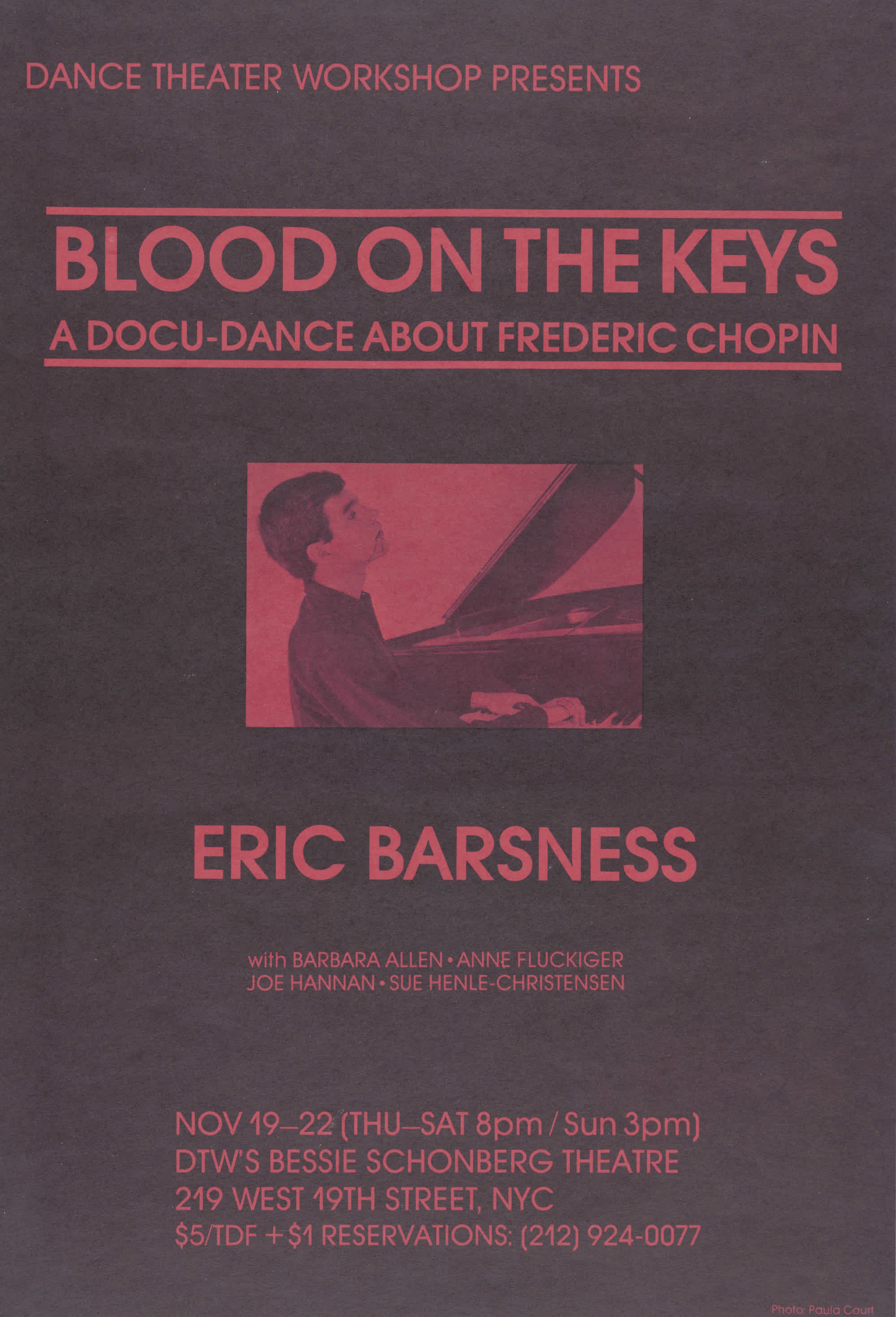 DTW Presents: BLOOD ON THE KEYS, A Docu-Dance About Frederic Chopin. Eric Barsness with Barbara Allen, Anne Fluckiger, Joe Hannan, Sue Henle-Christensen. Photo on poster by Paula Court.