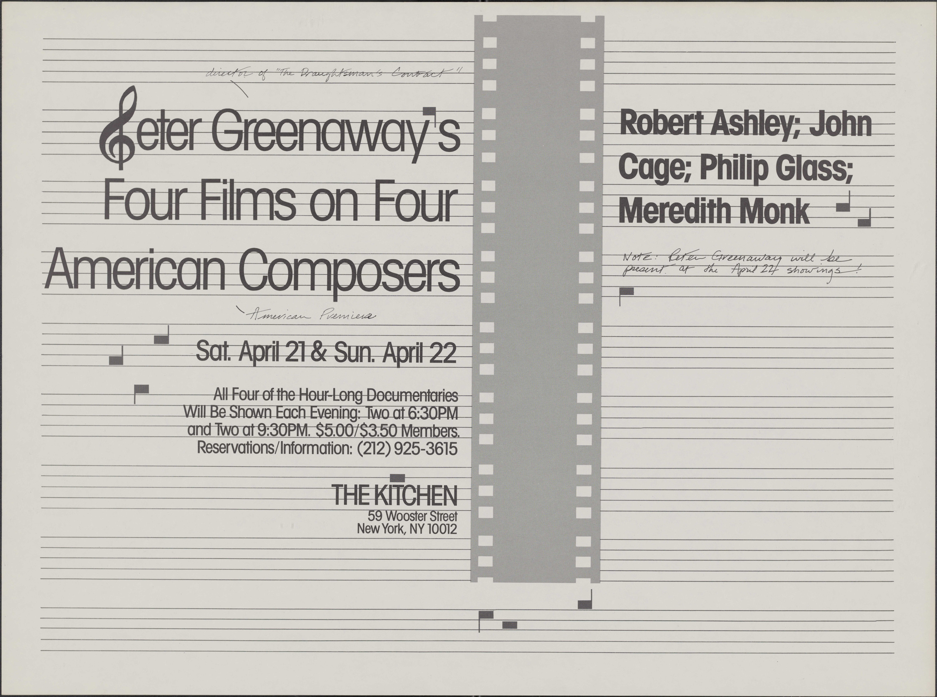 On April 21–22, 1984, Peter Greenway organized Four Films on Four American Composers, screenings of films on Robert Ashley, John Cage, Philip Glass, Meredith Monk, at The Kitchen. The series of films was produced by Revel Guest for broadcasting on Britain's Channel 4.