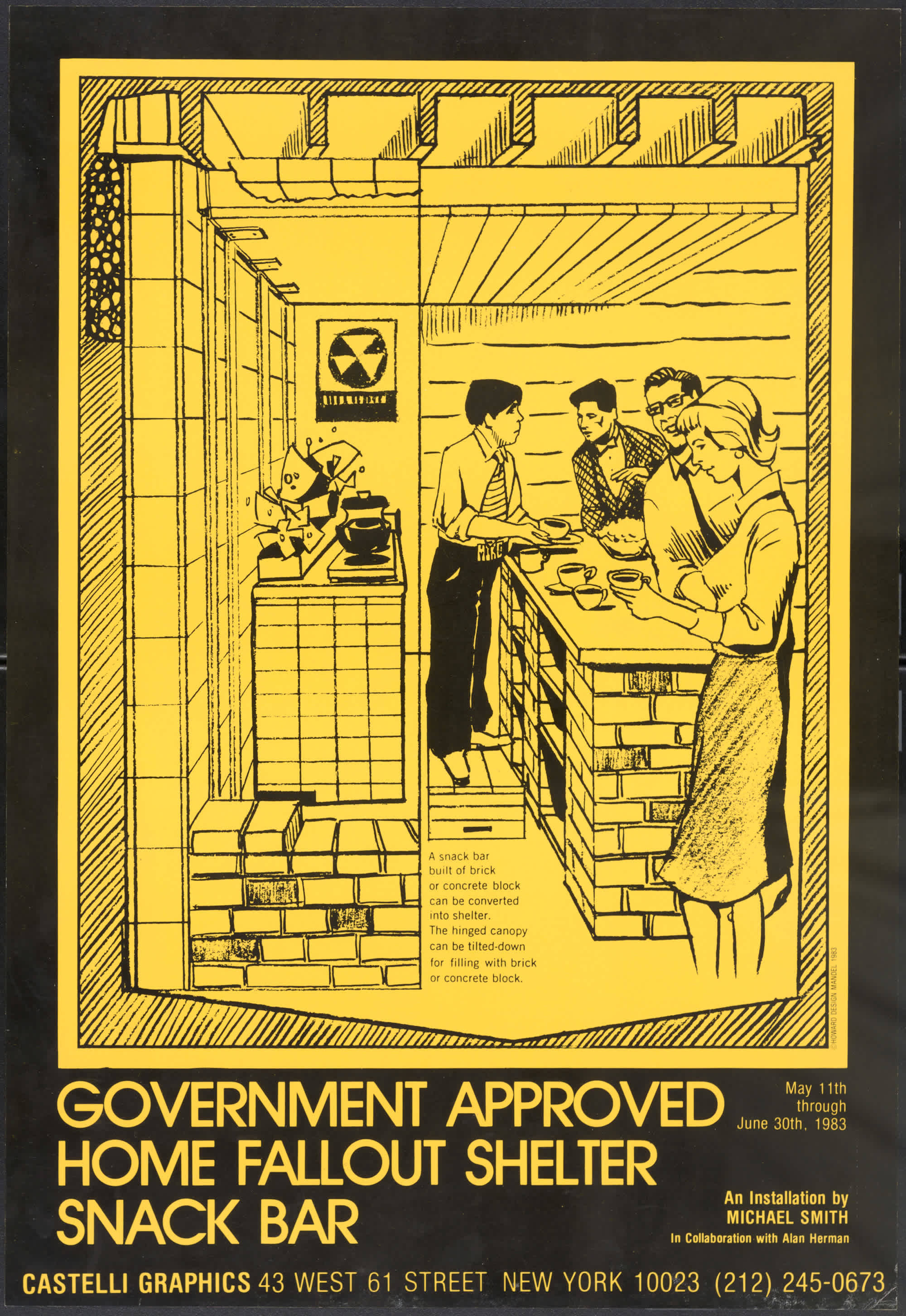 An installation by Michael Smith in collaboration with Alan Herman. A snack bar built of brick or concrete block can be converted into shelter. The hinged canopy can be tilted-down for filling with brick or concrete block. Castelli Graphics