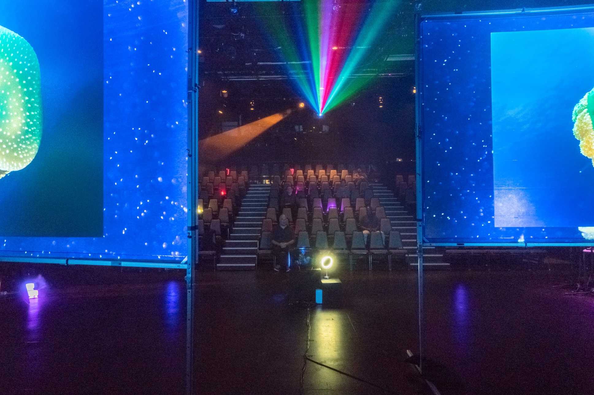 Sara Magenheimer’s first institutional solo exhibition, I Collect Neglected Venoms, transformed The Kitchen’s first-floor theater into a multi-sensory installation ruminating on questions of language and consciousness through video, sculpture, theatrical lighting, and a diffused custom ocean scent. Centered around the two-channel video Best is Man’s Breath Quality, the installation explored language’s ability to reproduce itself through culture and fundamentally shape perception. The video’s narrator, an ancient jellyfish, commented through an authoritarian voice-over on the state of human consciousness and perception. The disembodied nature of the human voice and the shifting psychological states present in the video were emphasized by the abstracted movements of genetically modified fluorescent fish projected onto the stage via a live-feed. Bookending the run of the show, Magenheimer presented two performances that illuminated multiple modes of perception through a collage of shared language and personal vernacular. This exhibition was curated by Lumi Tan and Tim Griffin.