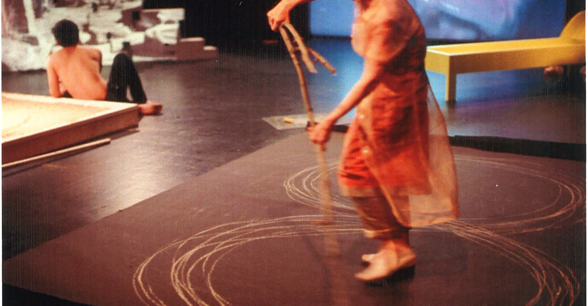 In 2004, Joan Jonas returned to The Kitchen with Lines in the Sand: Helen in Egypt. The multimedia production is based on the epic poem “Helen in Egypt” written by feminist American author Hilda Doolittle. Excerpts of the poem are interrupted by a Tribute To Freud, in which Doolittle discusses her analysis of the poem with Freud. Lines in The Sand also incorporates videos, drawings, and live performance. Multichannel projections with the head of Khafre on the Las Vegas strip are projected on the wall along with drawings by Jonas of sphinxes, pyramids, and spirals. The production comments on historical representations of Egypt juxtaposed with its contemporary kitsch appropriations, while also challenging the narrative that one woman was the sole cause of the Trojan War. Lines in The Sand was Jonas’s first time performing in New York in over a decade.