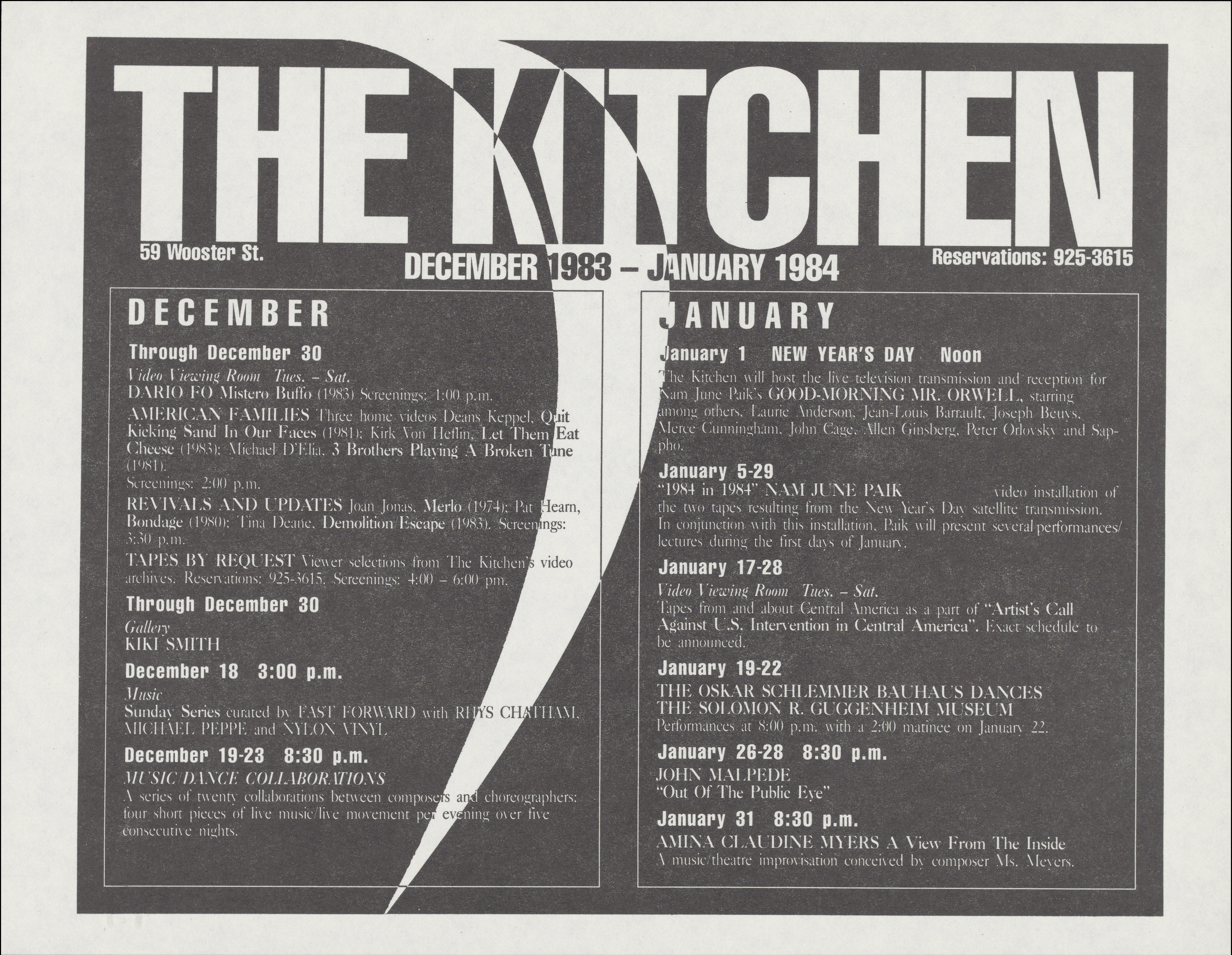 On January 26–29, 1984, Out of the Public Eye, a performance by John Malpede took place at The Kitchen. Performers included Ann Magnuson, Frank South and John Malpede, with video by Mark Fisher and music by A. Leroy.