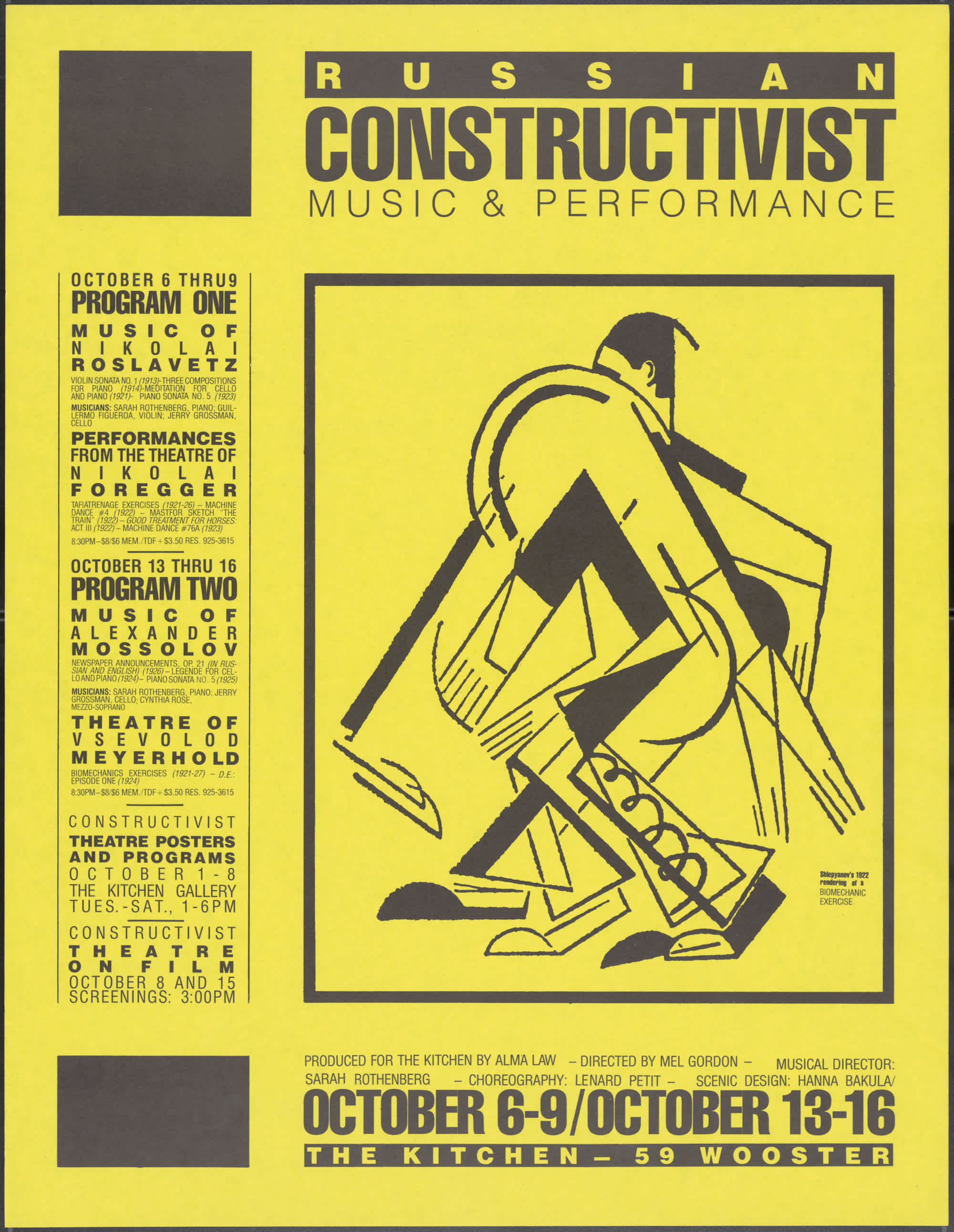 Russian Constructivist Music and Performance. Produced for The Kitchen by Alma Law; Directed by Mel Gordon; Music Director: Sarah Rothenberg; Choreography: Lenard Petit; Scenic Design: Hanna Bakula. PROGRAM ONE: Music of Nikolai Roslavetz and Performances From the Theater of Nikolai Foregger. PROGRAM TWO: Music of Alexander Mossolov and Theatre of Vsevolod Meyerhold. Exhibition of Theatre Posters and Programs in The Kitchen Gallery; October 1-8. Constructivist Theatre on Film October 8 and 15 Screenings: 3pm.