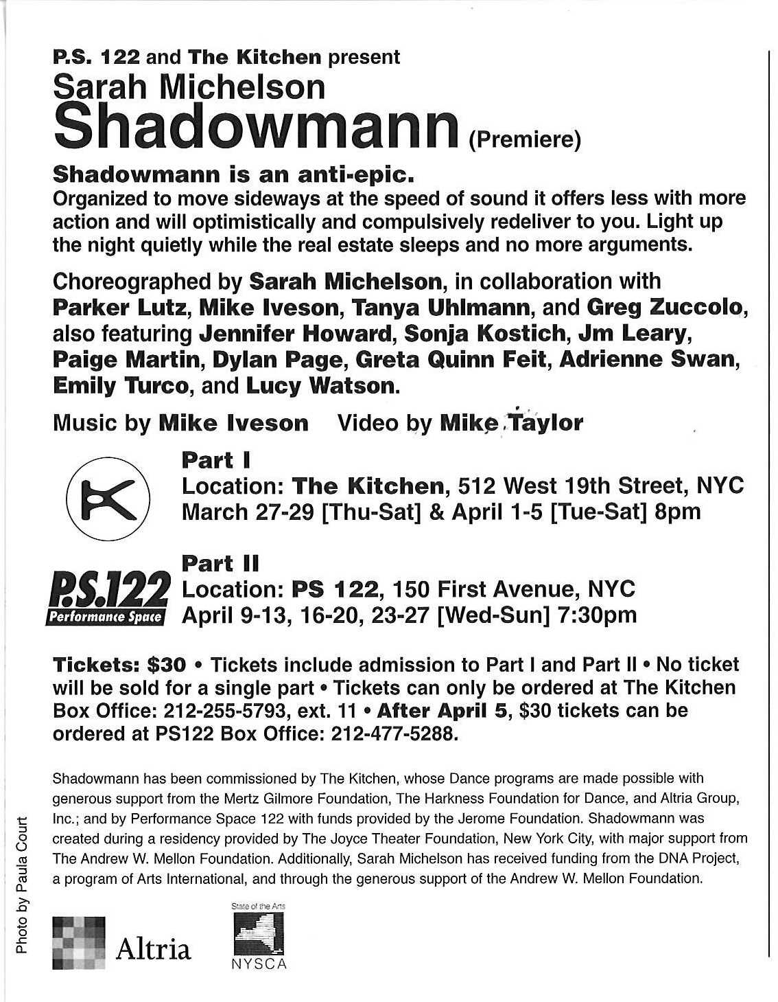 Sarah Michelson’s Bessie Award-winning work Shadowmann was performed in two parts: part one at The Kitchen and part two at P.S. 122. It was choreographed by Michelson in collaboration with Parker Lutz, Mike Iveson, Tanya Uhlmann, and Greg Zuccolo, with music by Mike Iveson and video by Mike Taylor. The cast also featured Jennifer Howard, Sonja Kostich, Jm Leary, Paige Martin, Dylan Page, Greta Quinn Feit, Adrienne Swan, Emily Turco, and Lucy Watson. Each part was tailored to the site, but both involved repetition and technically challenging movement mixed with stillness. The program describes the piece as “an anti-epic.”
