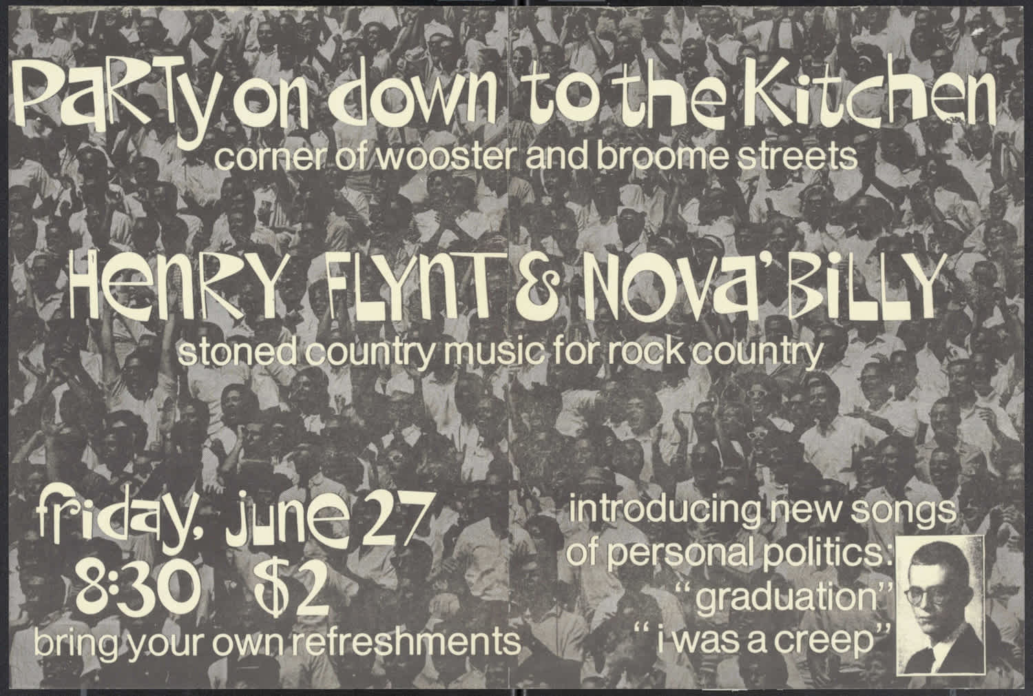 "Party on down to The Kitchen/corner of Wooster and Broome Streets." Henry Flynt and Nova'Billy/stoned country music for rock country. Introducing new songs of personal politics: "graduation", "i was a creep". Bring your own refreshments.
