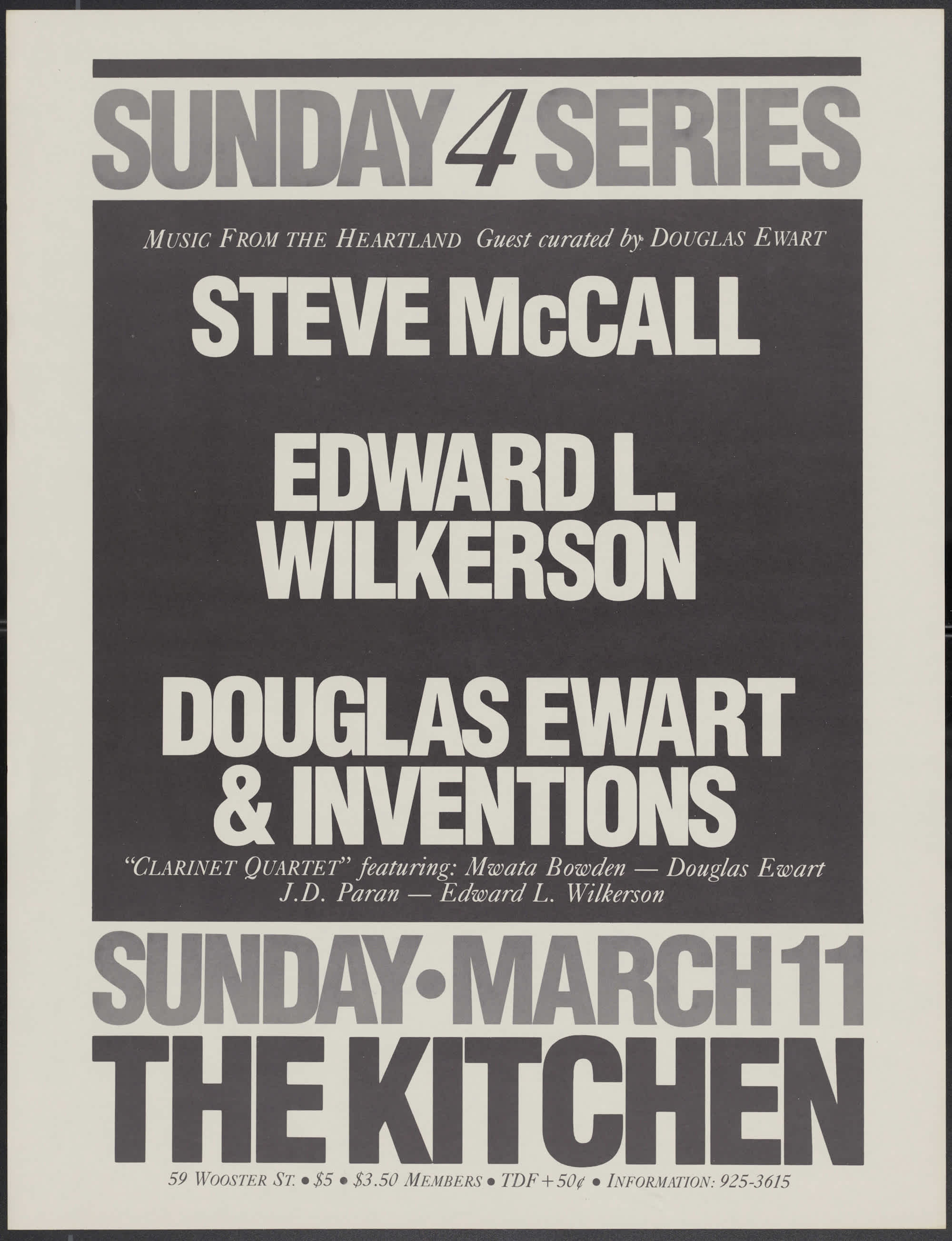 Music from the heartland, guest curated by Douglas Ewart. Steve McCall, Edward L. Wilkerson, Douglas Ewart + Inventions - "Clarinet Quartet" featuring: Mwata Bowden, Douglas Ewart, J.D. Paran (sic), Edward L. Wilkerson. Sunday, March 11. Poster misspells J.D. Parran's name.