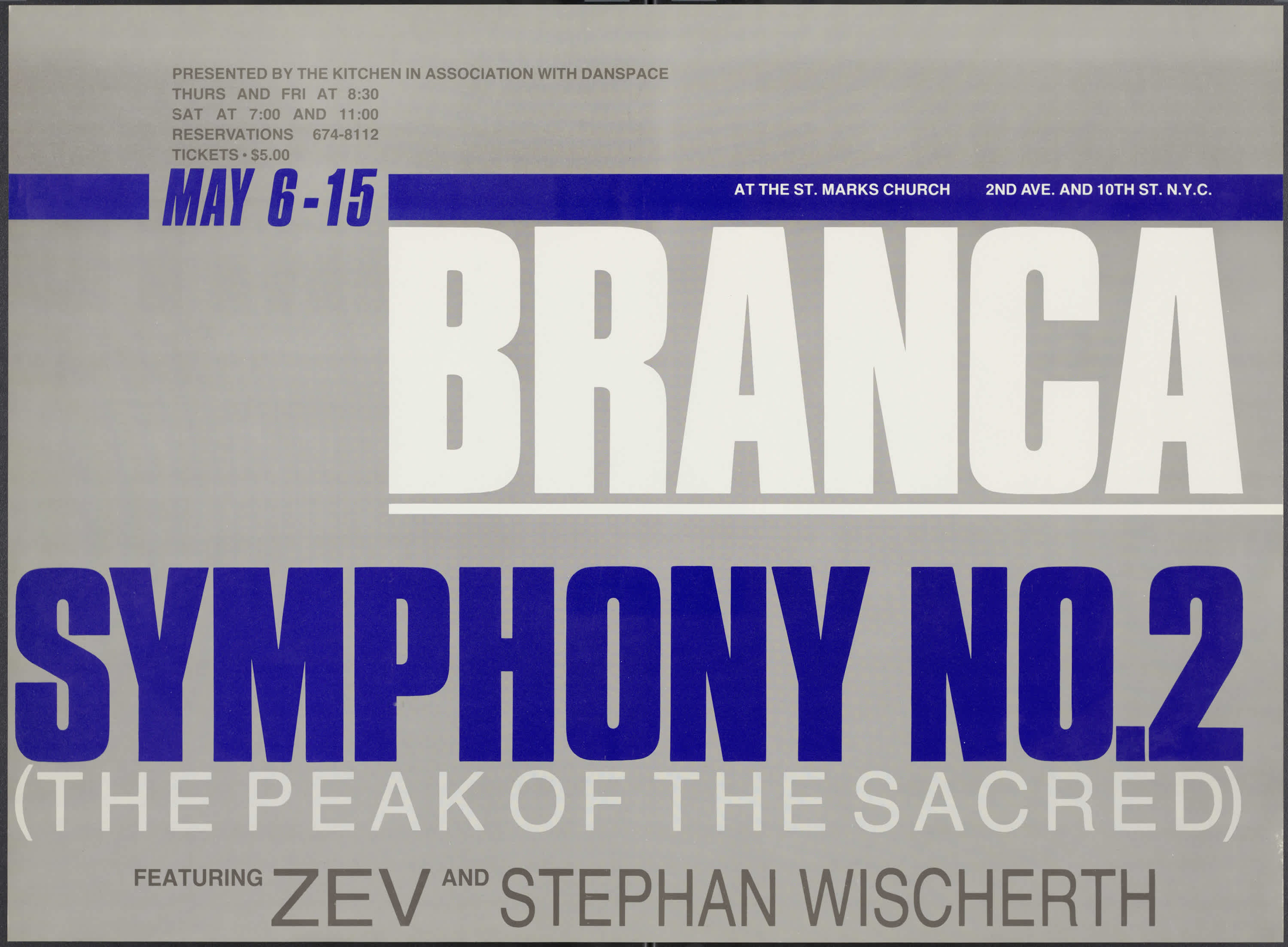Presented by The Kitchen in Association with Dancespace at The St. Marks Church. Branca: Symphony No. 2 (The Peak of the Sacred) Featuring ZEV and STEPHAN WISCHERTH.