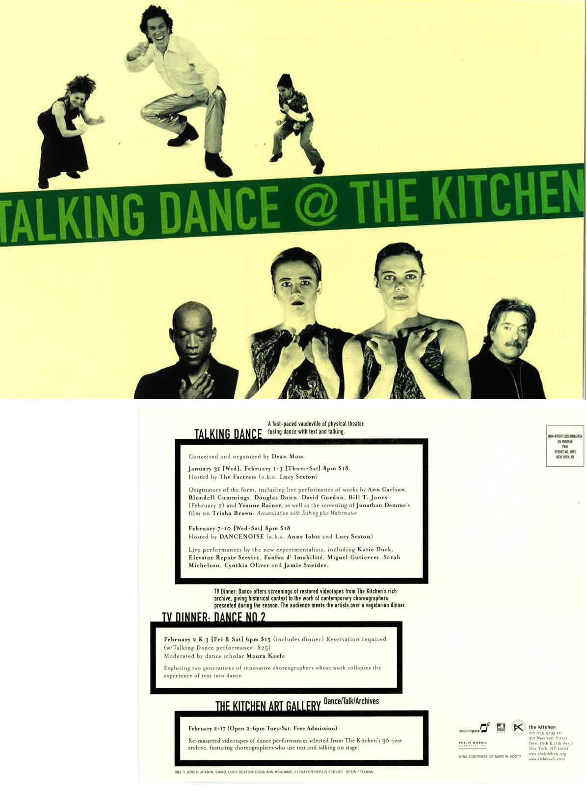 Talking Dance, a two part performance series curated by Dean Moss, aimed to combat the myth dance and language are inherently at odds. Talking Dance brought together two programs of experimental dance: one full of ’60s post-modern icons, and another with early-mid career choreographers working within the same legacy. Lucy Sexton and Anne Iobst of Dancenoise hosted both shows, and post-show panels were moderated by scholar Maura Keefe. Reviews from Wendy Perron, Gia Kourlas, and Jack Anderson recount a mixed bill of interpretations. In Accumulation With Talking Plus Water Motor, Trisha Brown spoke about making dances as she performed a piece of her choreography. Blondell Cummings paired her moving body with recordings of middle-aged women talking about aging. Miguel Gutierrez, true to form, performed a talking dance about talking dance titled It’s Time for Another One of Those Crazy Talking Dances in collaboration with Sarah Michelson.