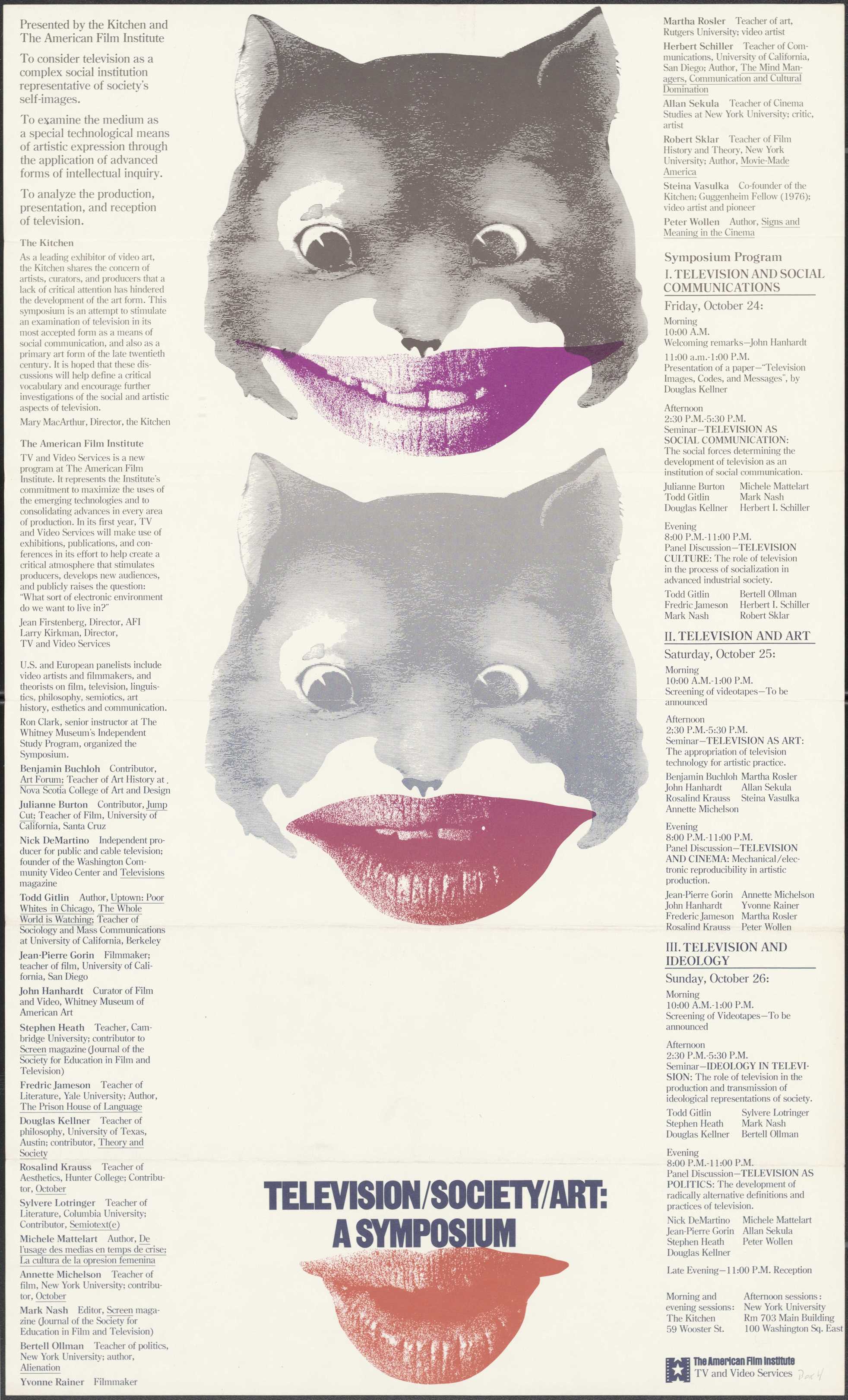 Television/Society/Art: A Symposium. Presented by The Kitchen and The American Film Institute. To consider television as a complex social institution representative of society's self-images. To examine the medium as a special technological means of artistic expression through the application of advanced forms of intellectual inquiry. To analyze the production, presentation, and reception of television. Panelists include: Ron Clark, Benjamin Buchloh, Julianne Burton, Nick DeMartino, Todd Gitlin, Jean-Pierre Gorin, John Hanhardt, Stephen Heath, Frederic Jameson, Douglas Kellner, Rosalind Krauss, Sylvere Lotringer, Michele Mattelart, Annette Michelson, Mark Nash, Bertell Ollman, Yvonne Rainer, Martha Rosler, Herbert Schiller, Allan Sekula, Robert Sklar, Steina Vasulka, and Peter Wollen. Organized by Ron Clark.