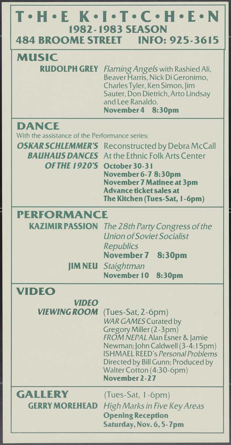 November Calendar Poster (3 of 3) featurring the music of Rudolph Grey, "Flaming Angels" with Rashied Ali, Beaver Harris, Nick Di Geronimo, Charles Tyler, Ken Simon, Jim Sauter, Don Dietrich, Arto Lindsay, and Lee Ranaldo; Oskar Schlemmer's Bauhaus Dances of the 1920's; Artist Collective KAZIMIR PASSION presenting the 28th Party Congress of the Union of Soviet Socialist Republics, and a performance by Jim Neu, and videos curated by Gregory Miller. The art of Gerry Morehead in the gallery.