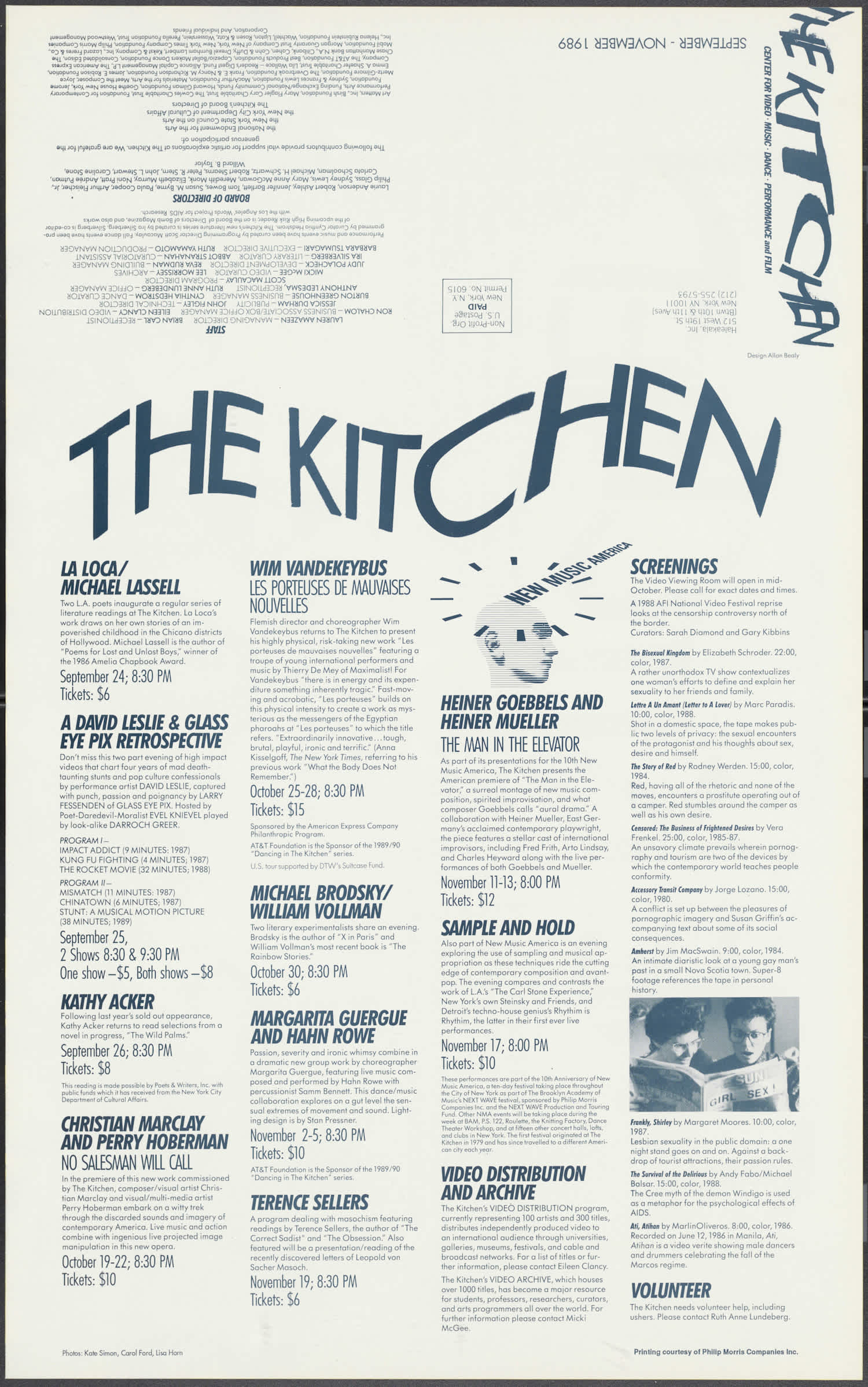 La Loca + Michael Lassell Sept 24, 8:30 PM David Leslie + Glass Eye Sept 25, 8:30 + 9:30 PM Kathy Acker Sept 26, 8:30 PM Christian Marclay + Perry Hoberman Oct 19-22, 8:30PM Wim Vandekeybus Oct 25-28, 8:30 PM