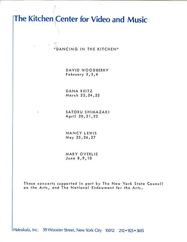 For the first six years after The Kitchen’s founding in 1971, dance performances were commissioned one at a time, without the structure of a formal dance series within each programming season. In 1977, however, The Kitchen received a grant to produce six dance concerts, allowing for the creation of The Kitchen’s first named series of dance programming: Dancing in the Kitchen. Staff member Eric Bogosian assumed the responsibilities of Dance Curator and, in the spring of 1978, organized the first performances in the series, which featured works by David Woodberry, Dana Reitz, Satoru Shimazaki, Nancy Lewis, and Mary Overlie.