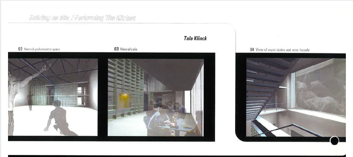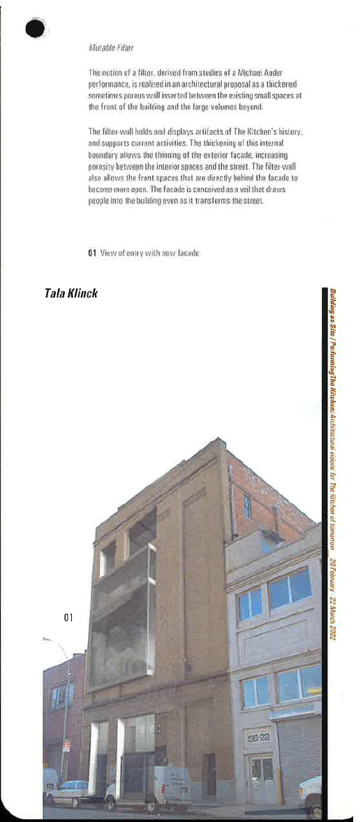 In February 2002, The Kitchen collaborated with Professor Linda Pollak and Harvard Graduate School of Design students to stage an exhibition conducting “an investigation of time and space that challenges preconceived ideas about theater, institution and the city.” (21) Building As Site: Performing The Kitchen read the institution’s location and physicality in a bodily grammar, characterizing the building as both a complex ecosystem and its own lifeform; similarly, the exhibition’s projects considered the interactions and support between “performers, audiences, and the neighborhood” of The Kitchen. (22) Designs by Tala Klinck, then-student and architect, proposed renovations to the edifice featuring a “mutable filter”— “a thickened sometimes porous wall… allow[ing] the thinning of the exterior façade, increasing porosity between the interior spaces and the street.” (23) Rather than “thresholds that divide one space from another,”(24) permeable layers of The Kitchen would “[draw] people into the building even as [they transform] the street.” (25)