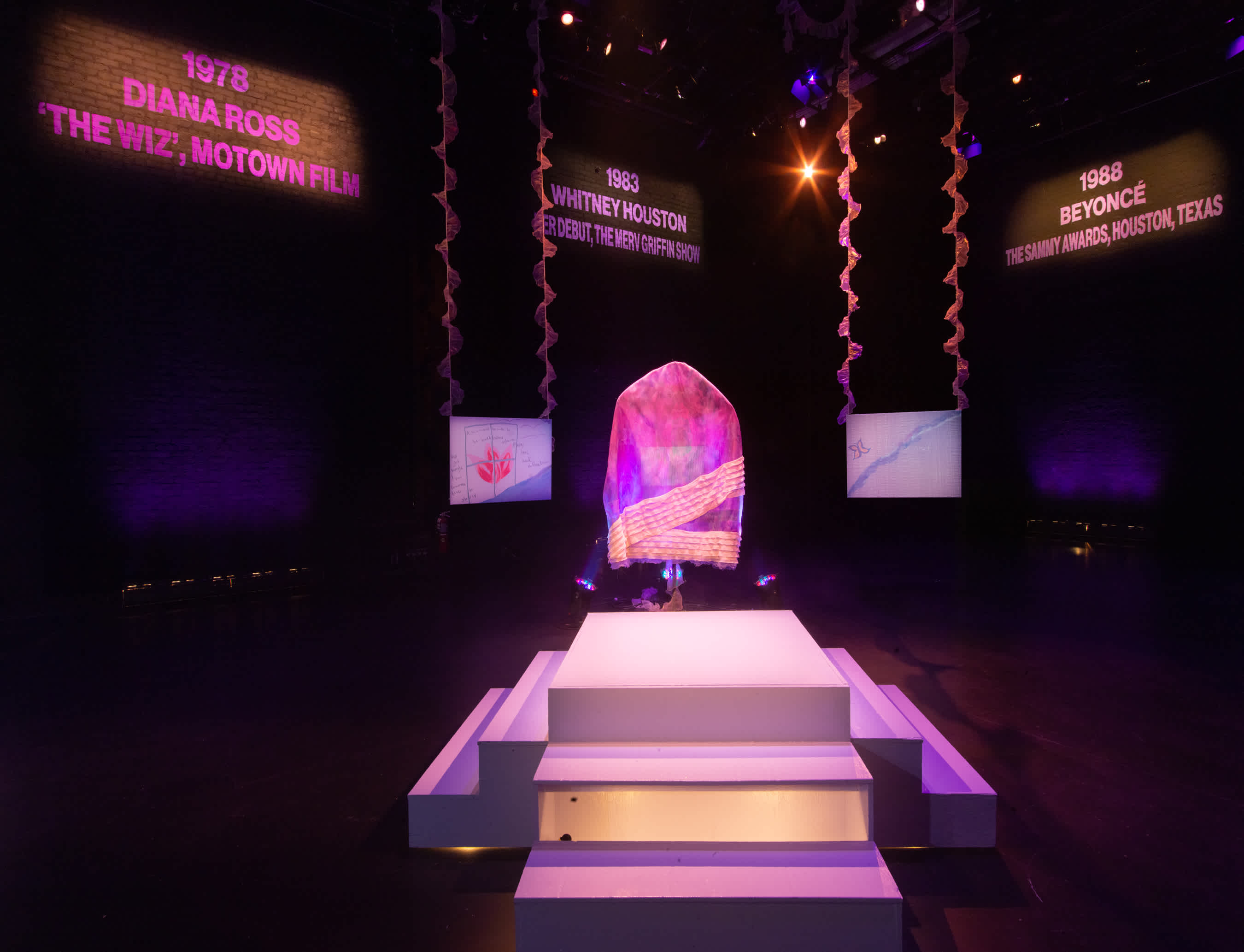 May 2022. A series of rehearsals marks the rhythm of The Kitchen’s final exhibition in its Chelsea building, before closing for renovations. Organized by Lumi Tan, Senior Curator, and Sienna Fekete, Curatorial Fellow, E. Jane: Where there’s love overflowing ran from April 1 to May 14, 2022, culminating in a performance by the artist’s persona, MHYSA. In the weeks before, the exhibition invited audiences “to listen in on” rehearsals through the closed doors of the first-floor black box. The invitation to eavesdrop on MHYSA’s voice but not her body moderated the audience's access to the diva while emphasizing the labor of the performer and the anticipation for it. Likewise, the elements of the exhibition—digital drawings, gouache text on the walls, sculpture, video, and a diva’s stage—are characterized in the Exhibition Score as performers in units of quintets, trio, and soloist. The exhibition’s title cites a lyric from the song “Home,” a classic from The Wiz, written by Charlie Smalls and first sung by Stephanie Mills as Dorothy in the 1975 Broadway premiere. Performer “group two,” a quintet of gouache paintings hand-brushed onto the walls, chronicles the timeline of the song’s renditions, “start[ing] when Stephanie Mills first breathed life into it, and end[ing] with Jazmine Sullivan, the R&B queen of our contemporary time.” Assembling a history not only of the song’s performance but of Black popular music as a loving body, E. Jane positions the exhibition as “talking about the archive as a space to find love overflowing.”