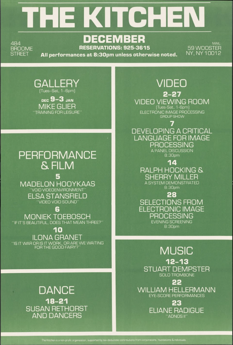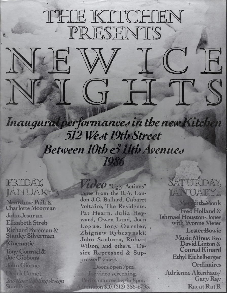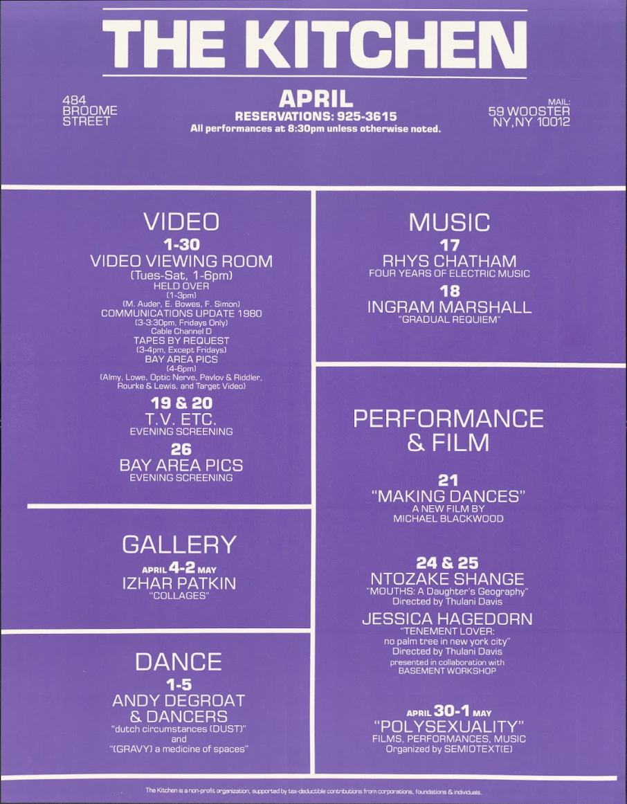 In celebration of its 50+ year Archive and the contemporary programs pushing the boundaries of artistic practices, The Kitchen is pleased to announce a new series of conversations with artists, past and present staff, and members of The Kitchen’s vast ecosystem. These conversations are anchored through The Kitchen’s original archival posters, which are available for purchase on The Kitchen's store, and serve as material histories and ephemera from The Kitchen’s programming.