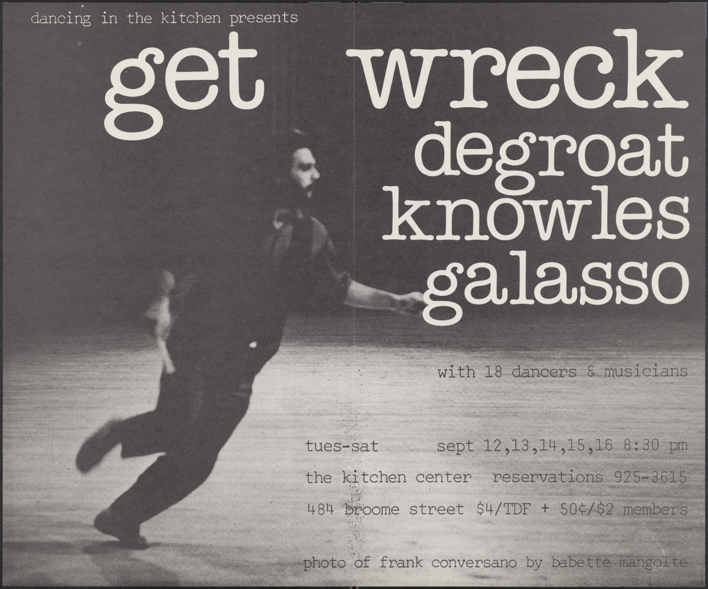 RF: I was looking at “Dancing in the Kitchen” histories from the late 70s and early 80s and Andy de Groat came up more than a few times. The Kitchen’s role as a space to create, present, and experience interdisciplinary work–an evergreen pillar of our program–is something I wanted to emphasize in his exhibition at 47 Canal. It's what I'm thinking about as I organize programs for our temporary space at Westbeth Artists’s Housing. This idea of seeking out collaborations that paved the way for interconnective work was really important to me and I was thrilled to include this particular collaboration between de Groat and Eastman. The material from our Archive, such as the fictional letter he wrote to Joan of Arc on and notated scores on program notes, was a distinctly new set of terms to consider this creative partnership.