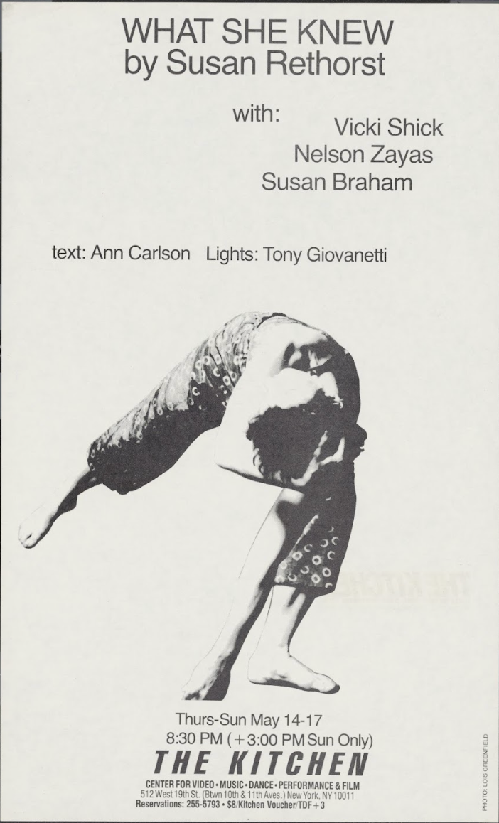 RF: There's a lot of overlapping threads, I think across the work that we have presented at 47 Canal and all the way up to what we all were privileged to see at Westbeth recently—the culminating performances of Dance and Process with Rena Anakwe, ms. z tye, and Ogemdi Ude. The first word that comes to mind is newness. This is very simple, but it's also very accurate because I think that in each instance from 40 or 50 years ago or when I was there for the DAP performances last week, there's like an overarching sense of curiosity and wonder for varying perspectives towards performance, movement, and engagement. It is like an exhilarating openness, and the energy you feel is undeniable. And I think that that is something that comes through with these video recordings. When I asked Sheryl Sutton about her experiences at The Kitchen, she said it was both frightening and also very exciting. I think that that must be something that many people feel when given the support and space to perform without inhibition. In "Dancing in the Kitchen" series, and I think parts of this remain today, is that there's this opportunity to experiment and present something that a particular artist has not done before. That's because The Kitchen gives this platform and provides this place to explore, to create and to fail and just to exist. And that’s what is so remarkable and outstanding about our history. These fundamental grounding points of our mission are steeped in each one of the works we’ve presented at 47 Canal but they are ever present in any work presented during The Kitchen’s five-decade history. Collaboration, coordination, and community–all simultaneously at work at The Kitchen. These are all radical works about the body in space and time.