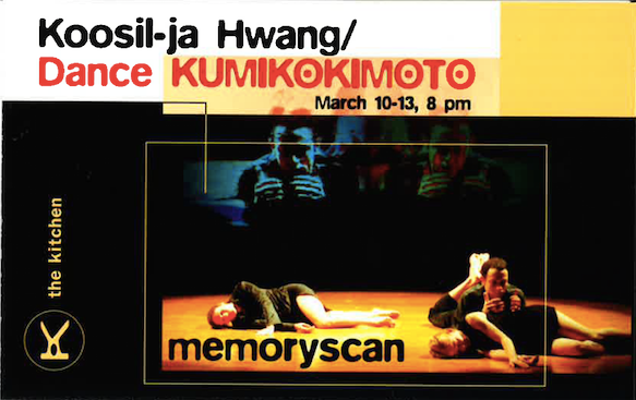 A WAVE OF EXCITEMENT sweeps over me when I rummage through The Kitchen’s archive. It holds a trove of events, experiments, gatherings, and ideas that do not merely dwell in the past, but also offer diverse perspectives that remain applicable today. Take for example Memoryscan, a dance performance choreographed by koosil-ja that was presented at The Kitchen in 1999. In this work, koosil-ja challenges the reductive language often ascribed to categories of race, ethnicity, and gender by focusing on individual narratives that highlight the complex cultural and sociopolitical layers of one’s self-identity. When speaking about Memoryscan in a 1999 interview with Gia Kourlas for Time Out New York, koosil-ja asked, “everyone from the US comes from another place; how do they deal with their culture and their ethnicity? How do they negotiate the terms?” Over twenty years after the performance initially took place, these questions bridging ethnic ties and cultural associations have become ever more relevant as we navigate an accelerated transnational landscape.