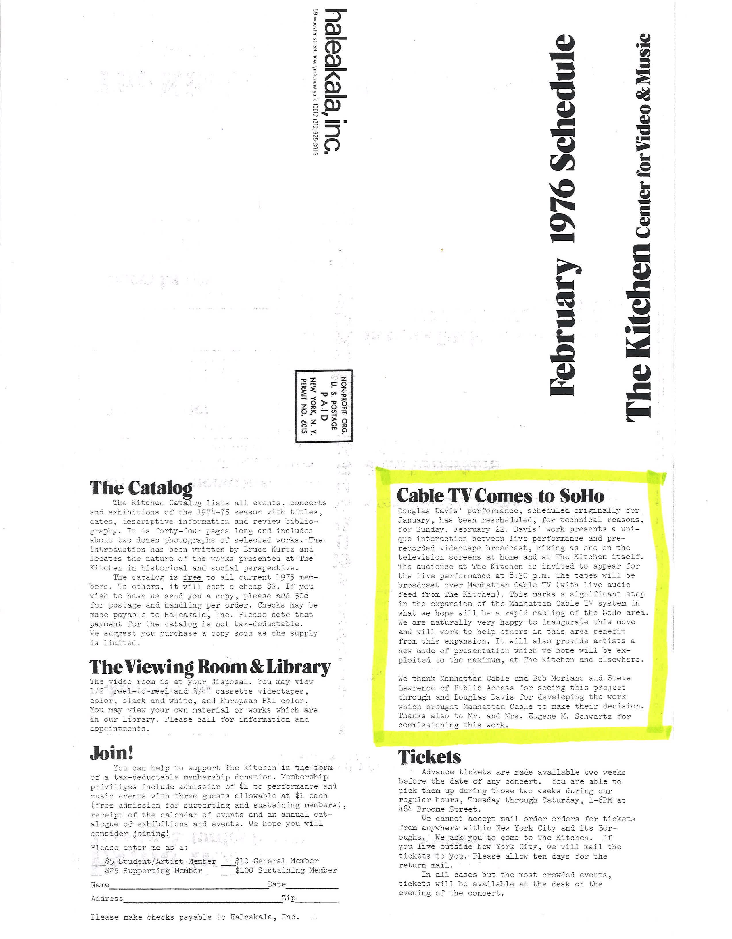 The Kitchen programming calendar, February 1976. Back. Emphasis added by Wong Kit Yi, 2023.