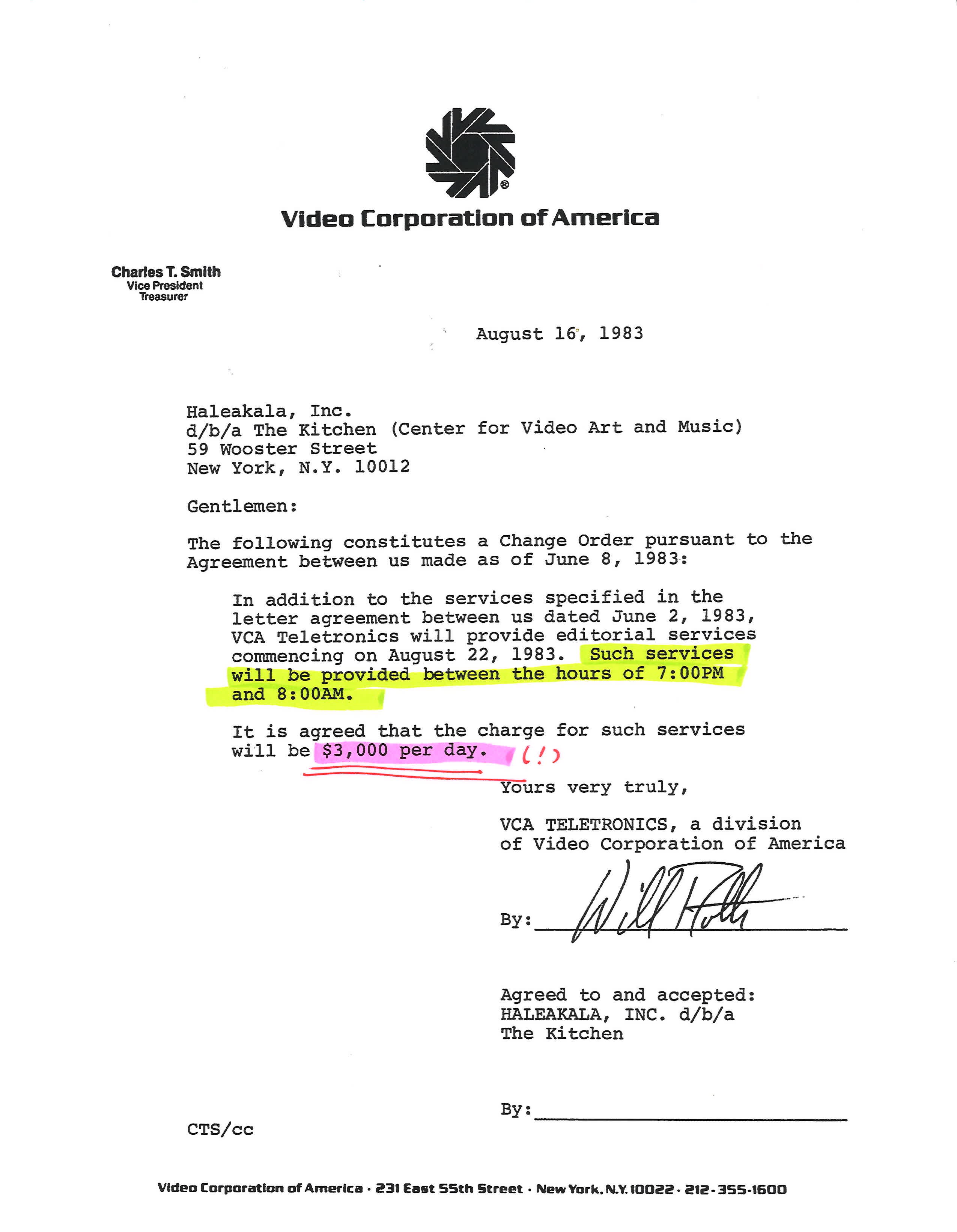 Letter from VCA Teletronics to The Kitchen, August 16. 1983. Emphasis added by Wong Kit Yi, 2023.