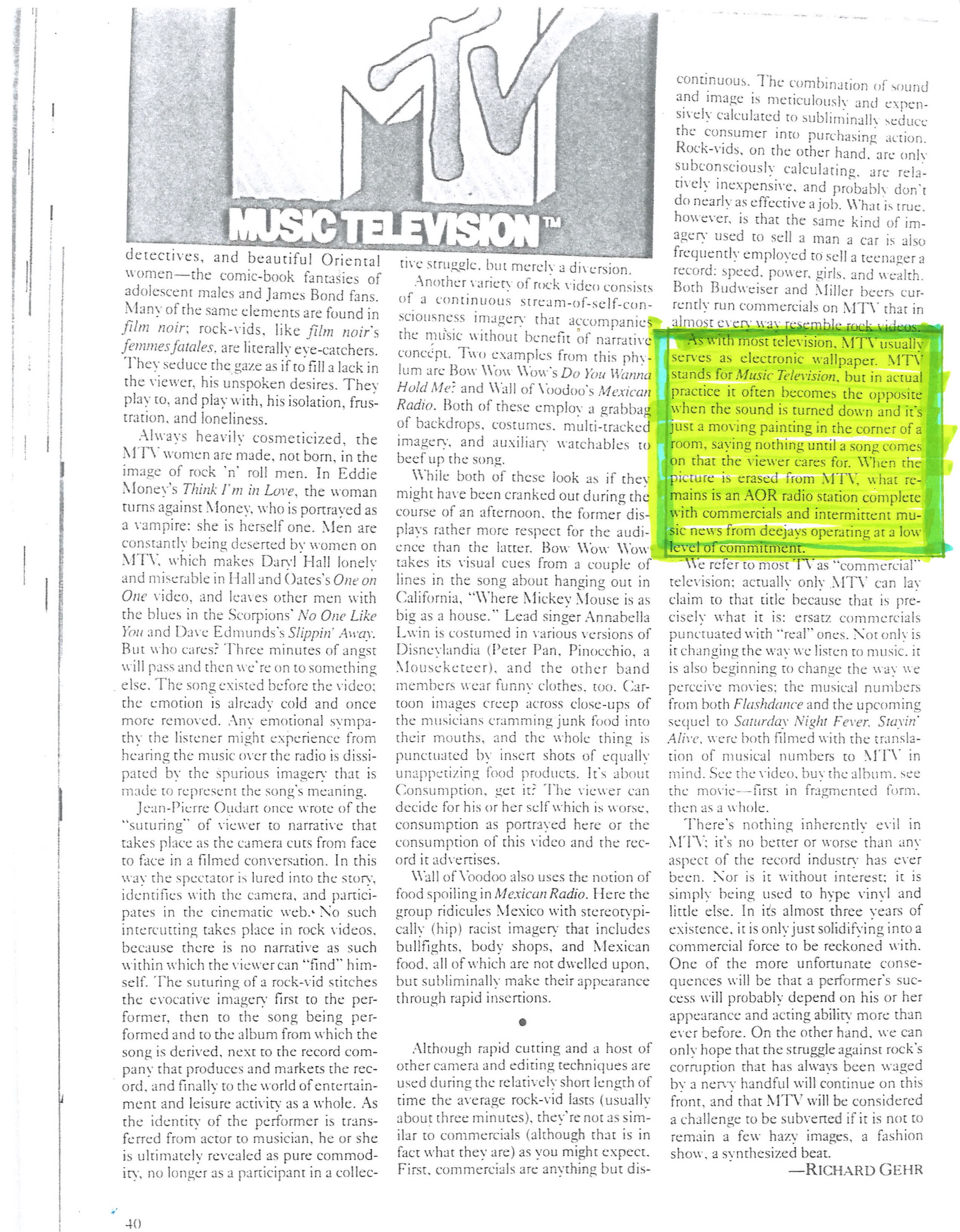 Richard Gehr, “The MTV Aesthetic,” in Film Comment, Vol. 19, No. 4, July-August 1983, 40. Emphasis added by Wong Kit Yi, 2023.