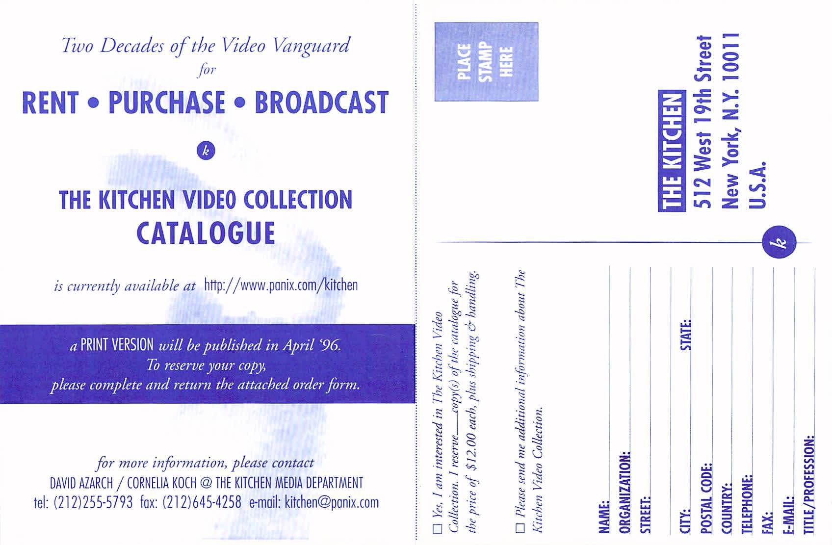 Postcard order form for The Kitchen Video Collection Catalogue, c. 1996. Front and back.