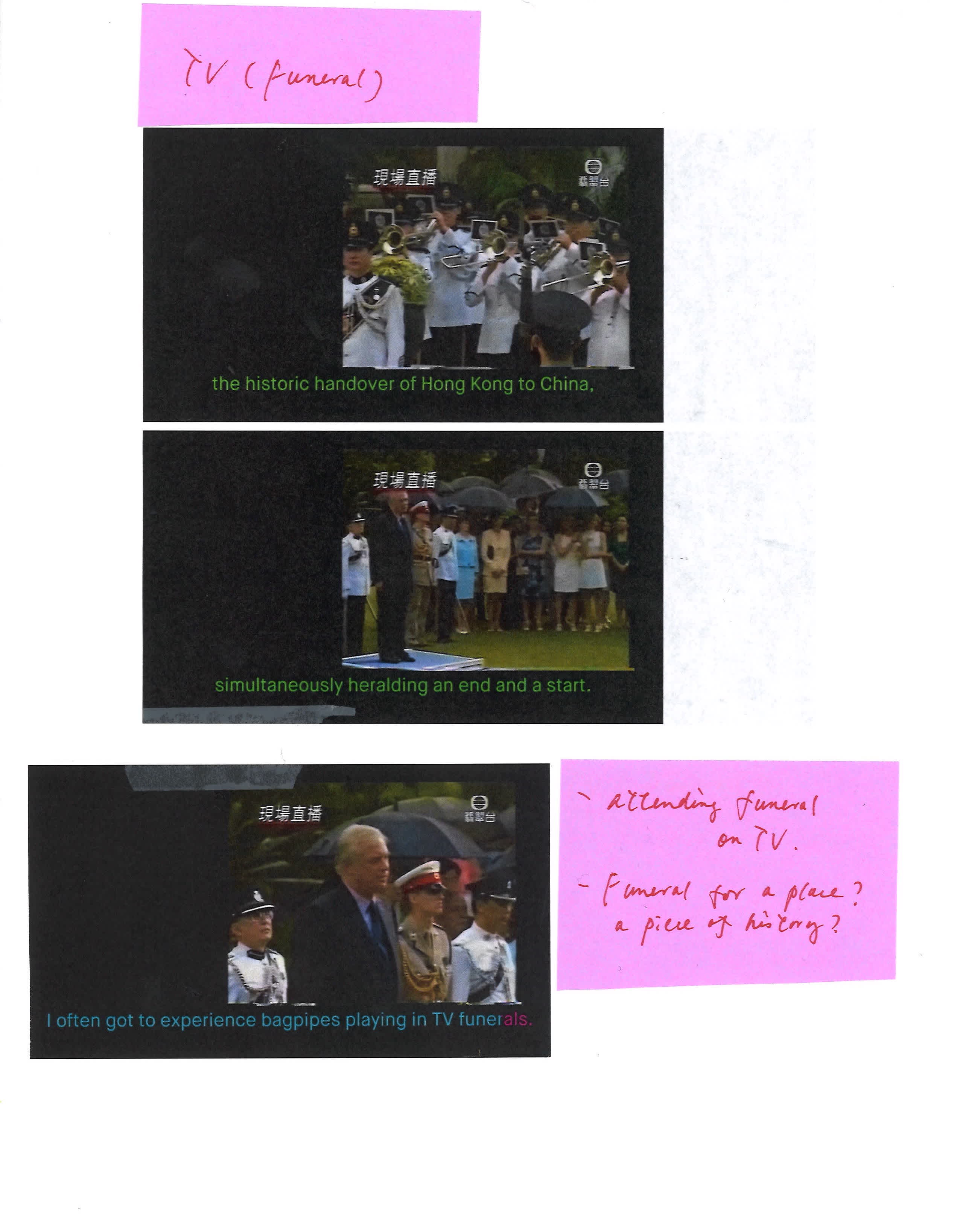 DIAL 432 TO SEE THE LIGHT (with Kitchen archive-inspired notes on TV funerals, bagpipes, traveling tape, hidden frequencies, and more) takes on the format of a process journal to offer a first glimpse into the artist’s ongoing endeavors. Structured according to overarching concepts, each section showcases archival selections the artist has annotated with markings, text, and video stills to reveal details or resonances that have piqued her curiosity. By illuminating Wong’s inquiries, observations, and speculations while still in formation, this presentation celebrates forms of knowledge that reveal themselves more through emergent correlations than through systematic investigation. While Wong continues to unfold her research in 2024, this Video Viewing Room will remain as a marker of where her hypotheses and findings have led her in December 2023, spotlighting one point along the path as she moves toward formulating as-yet-unknown narratives for future project iterations.