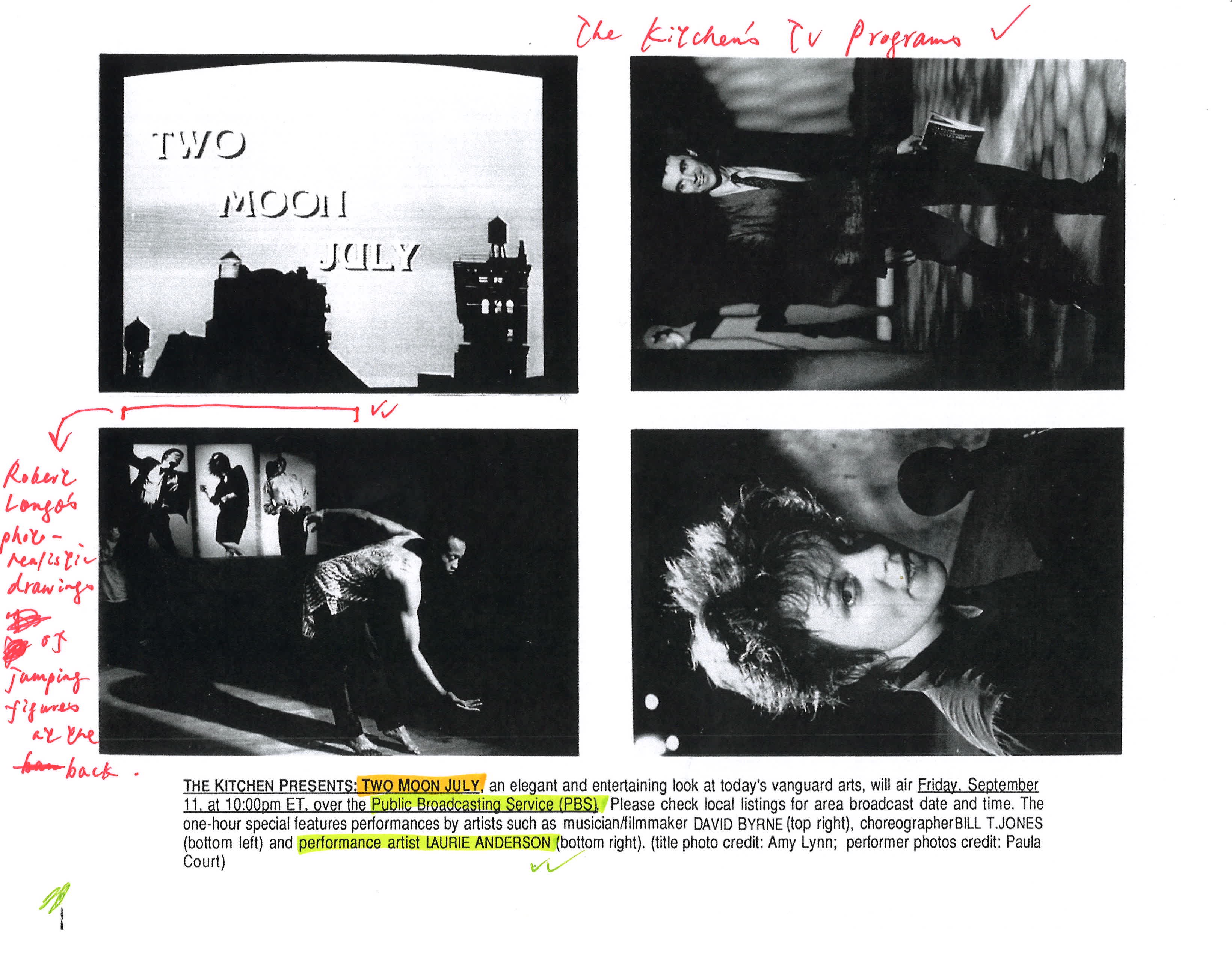 Promotional packet photo for The Kitchen Presents: Two Moon July, directed by Tom Bowes and produced by Carlota Schoolman, 1986. Emphasis and notes added by Wong Kit Yi, 2023.
