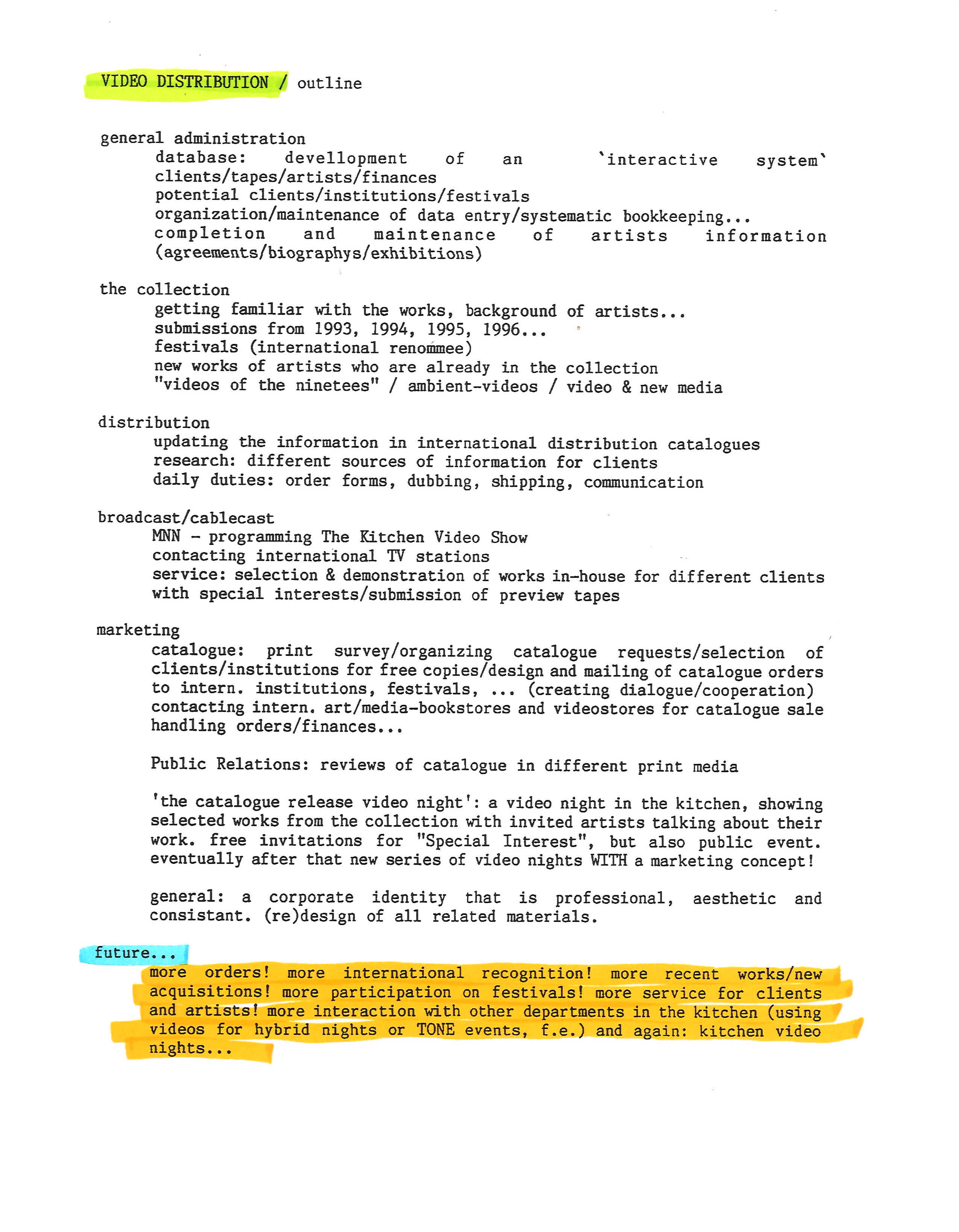 The Kitchen, outline for Video Distribution program, c. 1996-1997. Emphasis added by Wong Kit Yi, 2023.