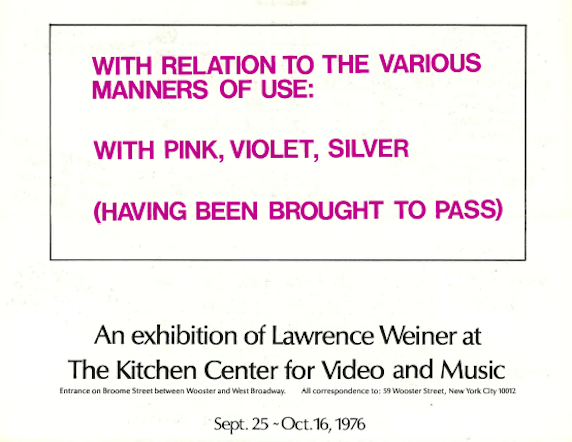 Lawrence Weiner was a central figure in the formation of conceptual art in the 1960s. He has been using language as the primary medium for his works since the late 1960s. Presented in capital letters, his structures consisting of language, or text fragments, often accompanied by graphic marks and lines, have been exhibited around the world and interpreted into numerous languages. He exhibited his work and participated in events frequently at The Kitchen during the 1970s.