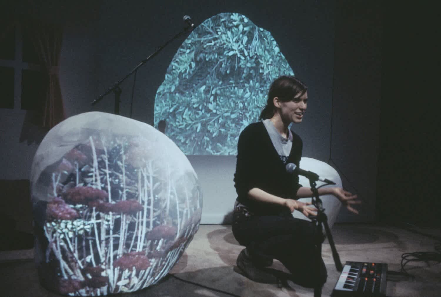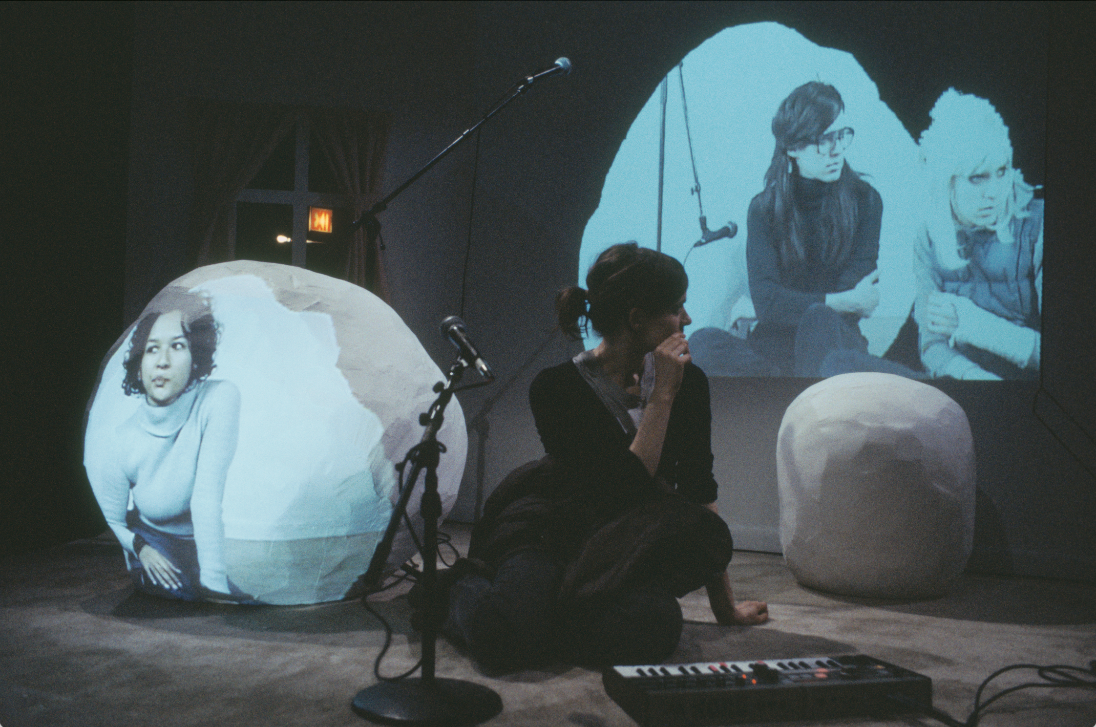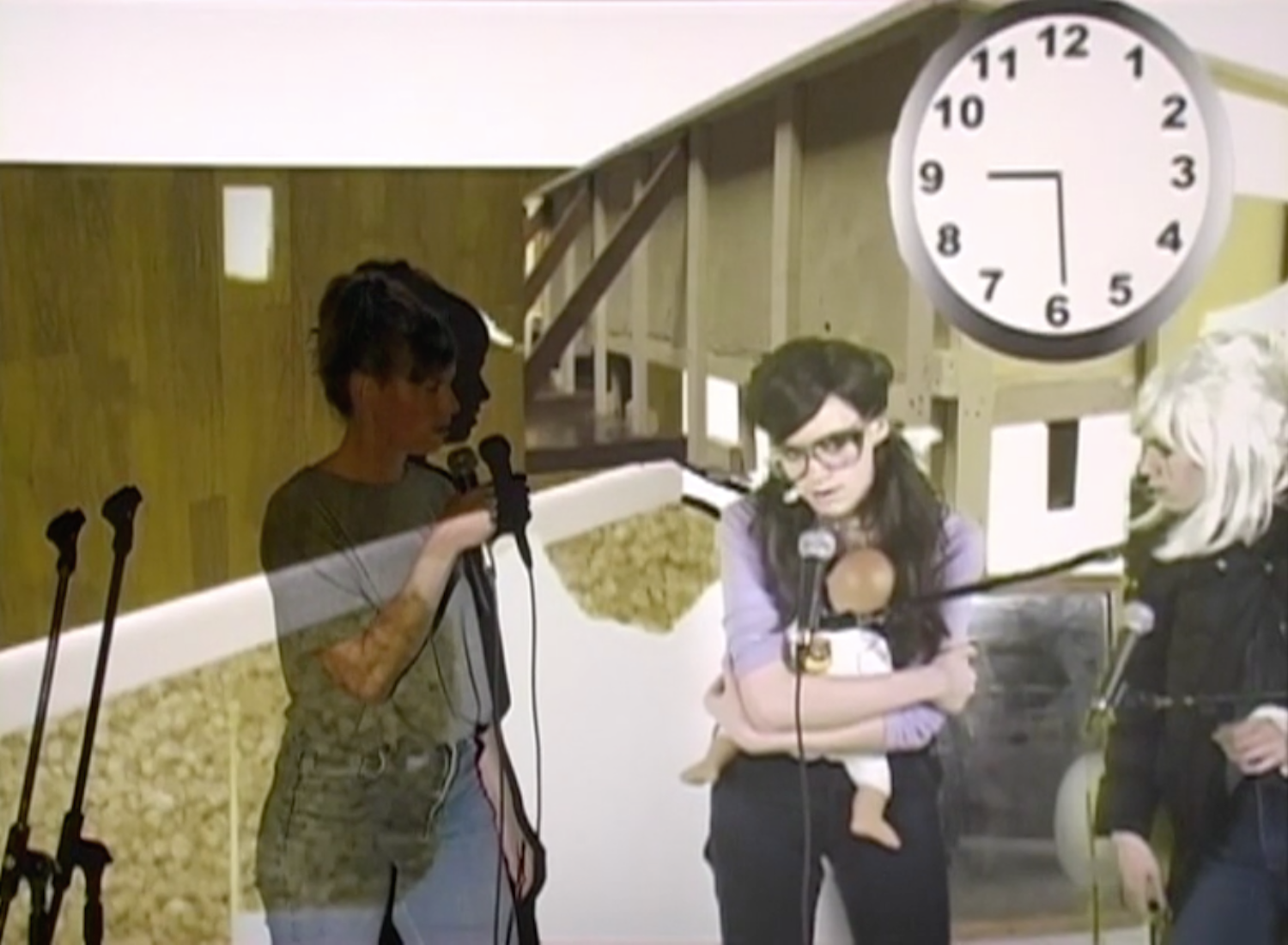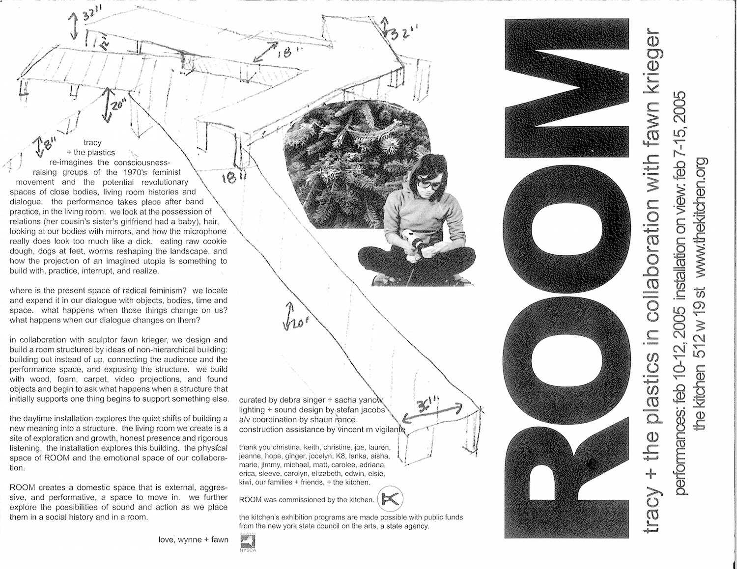 Tracy + the Plastics is a band created and performed by Wynne Greenwood, which came out of the DIY scene in the Pacific Northwest at the end of the last century. Performing in basements, living rooms, and punk clubs, Greenwood would inhabit all three band members, singing live as Tracy while interacting with band members Cola (on drums) and Nikki (on keyboards) as video projections behind her. The project soon found a home in visual art spaces too, and Tracy + the Plastics was invited to participate in the 2004 Whitney Biennial. Those biennial performances took place at The Kitchen in April 2004. Soon after, The Kitchen commissioned Greenwood and sculptor Fawn Krieger to create ROOM, an installation and performances which situated Tracy + the Plastics in a kind of deconstructed “living room” alongside and close to the audience. Together they explored identity and communication, re-imagined 1970s feminist consciousness-raising groups, and questioned the state of radical feminism. ROOM premiered in February 2005 at The Kitchen and was then restaged at Moore Space, Miami in September–November 2006.