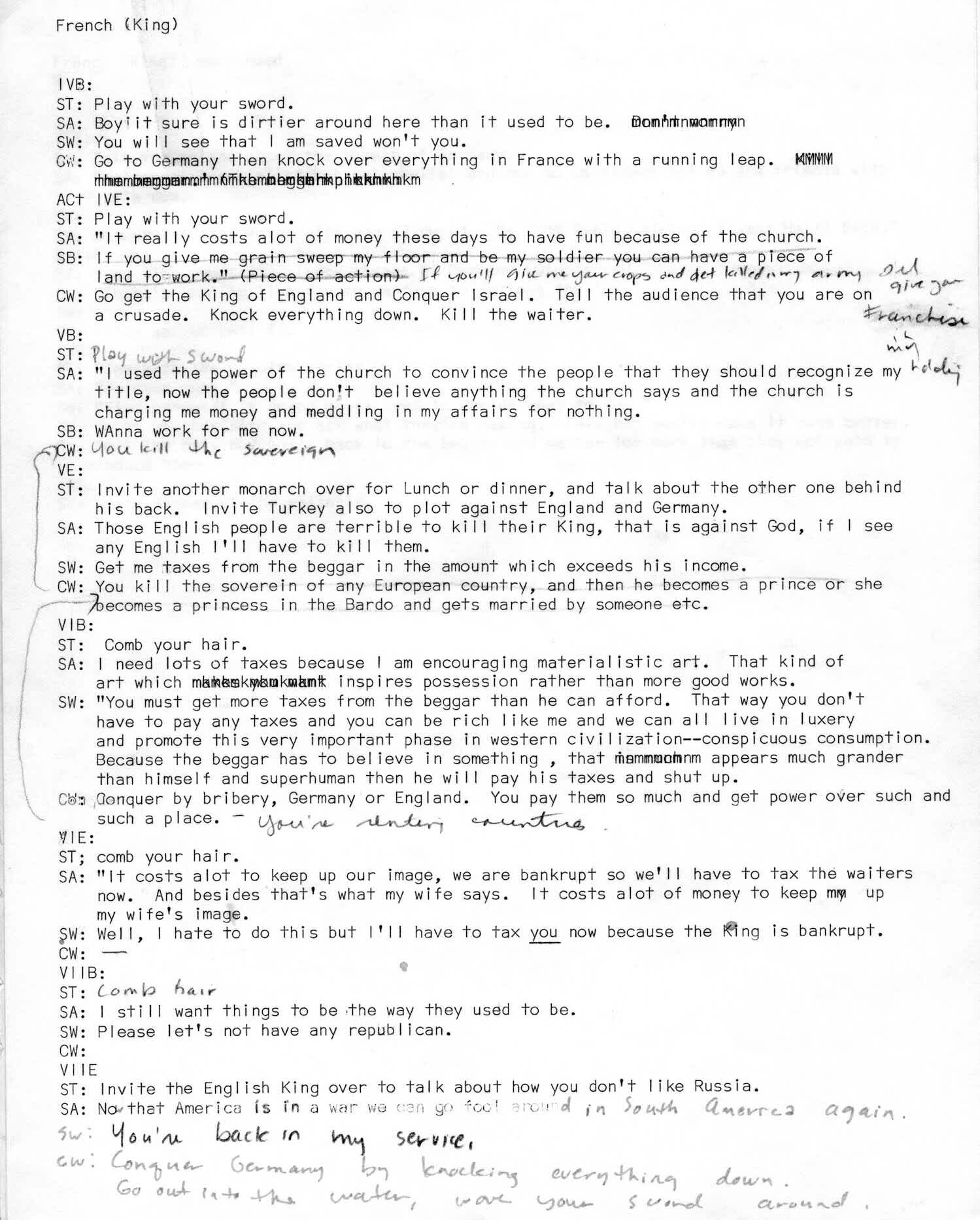 The different acts of the play were about the countries that were most influential in the history of the time. The structure of the play was that in each country, there was a beggar, a waiter, and a king. The beggars had a bin full of stuff, with screws and food in it. So the waiter who represented the middle class would come over and collect taxes or rent from the beggar (peasant class), and get some of the things out of their bin. Then eventually the king would gather taxes from the middle class. After pontificating a bit, Stanley would come over and grab all the spoils from the kings. In every act Stanley played whoever was the most powerful character in the history of the time. Some characters had songs.