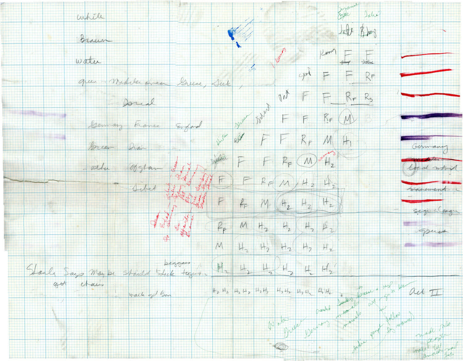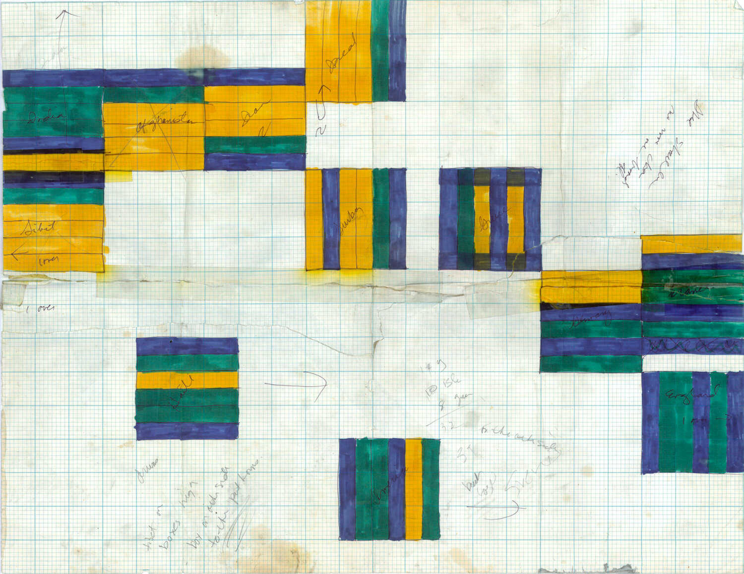 Many countries are represented in the play. Each country was on a flat in The Kitchen’s space made of boards of foam core. The boards were painted—three of them would be green if there was a lot of greenery in the country, and one of them would be brown if there was some desert, or two of them blue if there’s a lot of ocean around the country. They were all slightly different depending on the makeup of the country.
