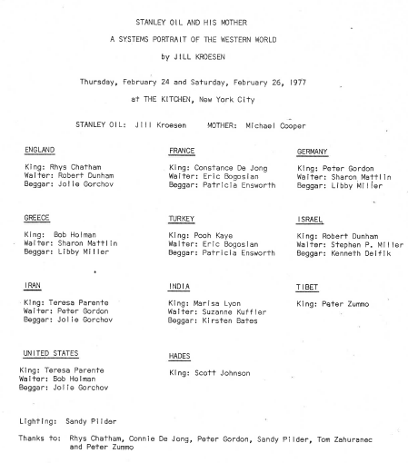 AB: The Kitchen’s press release for Stanley Oil and His Mother provides a concise introduction to the performance: “Stanley Oil and His Mother: A Theatrical Systems Portrait of the Western World is a large scale work for 36 performers involving music, dance and conversation. The scope of this historical work covers the span of time from the age when plant life dominated the Earth to the near future. Social structures within the various countries of the world are exposed to our view by the presence of Kings and Queens, Beggars and Waiters and Waitresses.” What prompted you to take on a retelling of history at that moment in the mid-1970s? And as you began to develop the piece, how did you conceive of the structure for portraying this vast subject matter and collaborating with such a large group of performers?