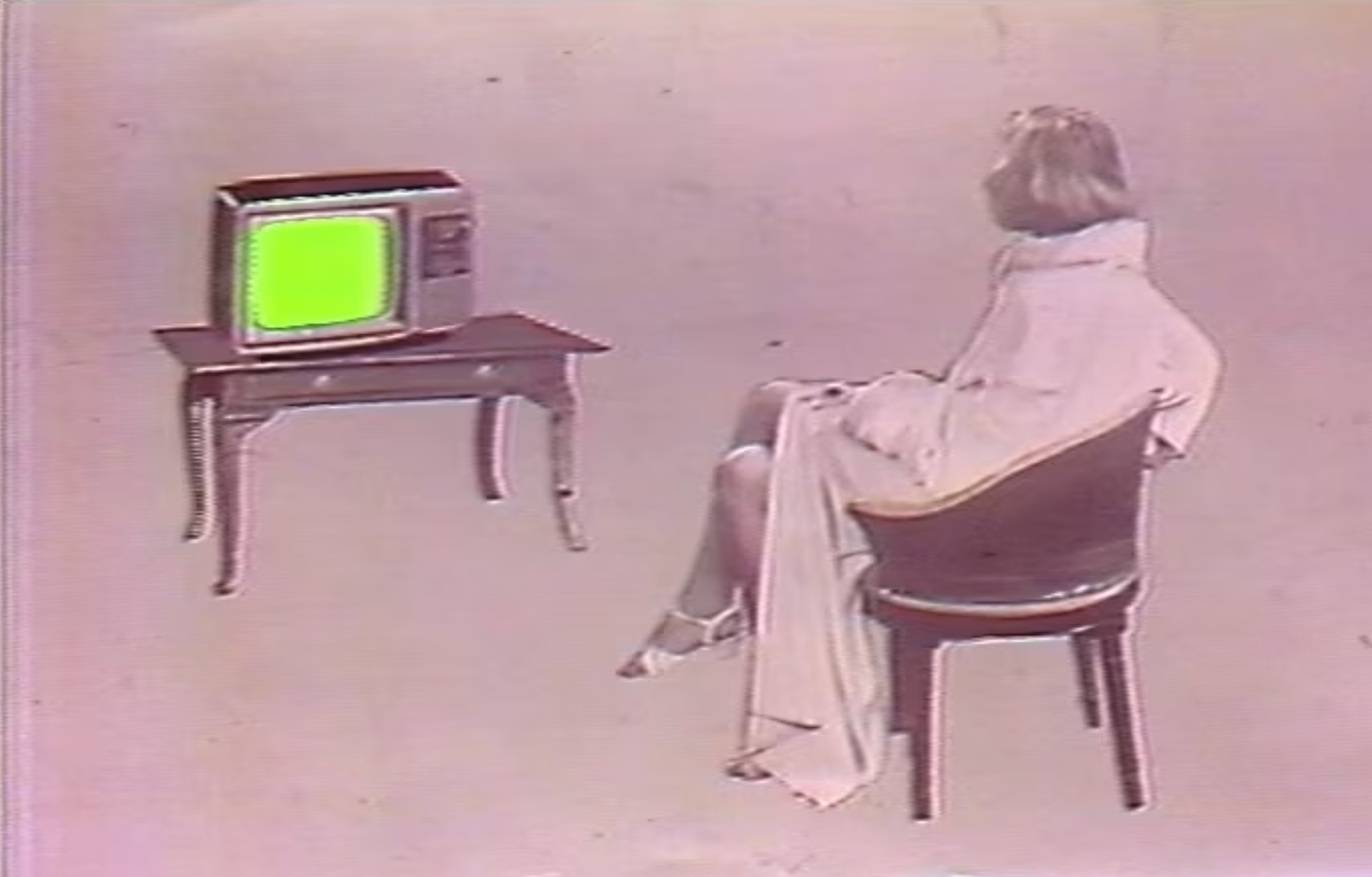 Test Patterns further subverts the genre of interview and television documentary in what Hershman Leeson describes as a “factional docudrama.” In this work, a man bears the likeness of the television test pattern personifying television media while recounting his memories of the assassination of John F. Kennedy–shown alongside footage of a reenactment–and musings of banal television content he encountered that day.