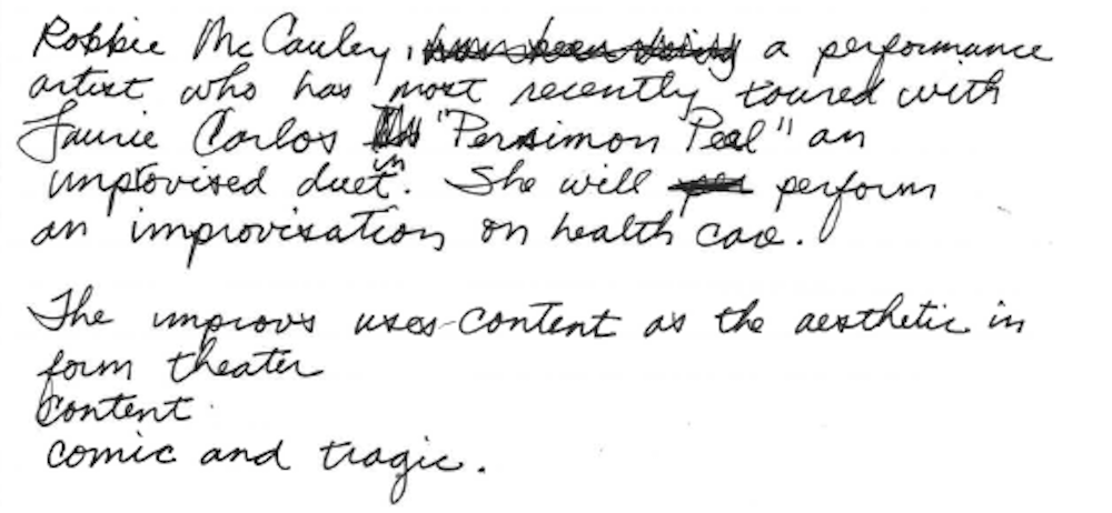 RM: My theater training was out of a process with Kristin Linklater. She was an incredible innovator in terms of voice for actors, which she connected to the body. And so by that time, I had embodied that practice of finding my words connected to the body and the feelings.