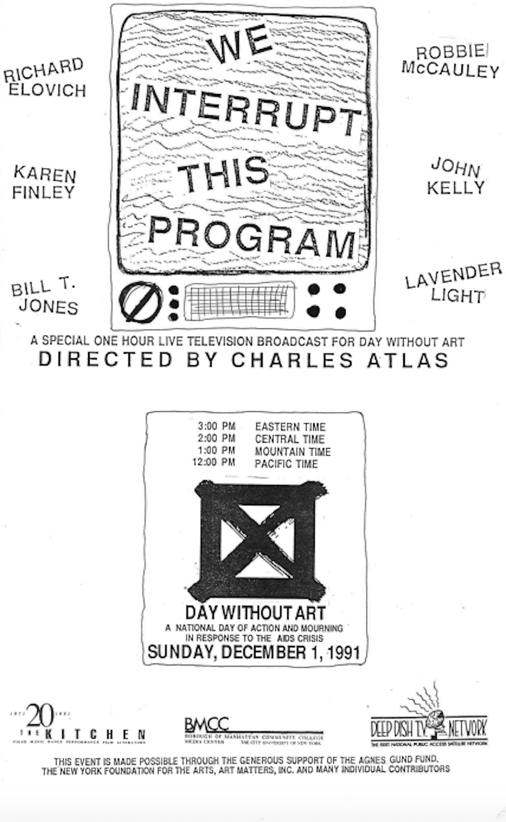 This Video Viewing Room features a recording of the live television broadcast We Interrupt This Program (1991), presented by The Kitchen in association with Visual AIDS for Day Without Art 1991. The broadcast was directed by Charles Atlas and included performances by DANCENOISE, Richard Elovich, Karen Finley, Bill T. Jones and Estella Jones, John Kelly, Lavender Light, and Robbie McCauley. Additionally included on this page are ephemera from The Kitchen’s archive and a video conversation between Atlas, scholar Roderick Ferguson, art historian and former Visual AIDS Program Director Alex Fialho, and McCauley, recorded in November 2020. The written transcript of that conversation follows, with minor edits made for style and clarity.