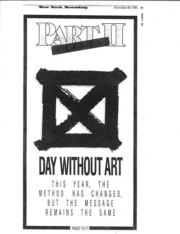 Day With(out) Art is an international day of action and mourning in response to the AIDS crisis that takes place annually on December 1. Visual AIDS organized the first Day Without Art in 1989 in response to the worsening AIDS crisis and coinciding with the World Health Organization’s second annual World AIDS Day on December 1. A committee of art workers (curators, writers, and art professionals) sent out a call for “mourning and action in response to the AIDS crisis” that would celebrate the lives and achievements of lost colleagues and friends; encourage caring for all people with AIDS; and educate diverse publics about HIV infection. In years since the first Day Without Art in 1989, various arts organizations, museums, and galleries have participated through actions such as shrouding artworks and replacing them with information about HIV and safer sex, locking their doors or dimming their lights, and producing exhibitions, programs, readings, memorials, rituals, and performances. In 1998, for its 10th iteration, Day Without Art became Day With(out) Art. Visual AIDS added the parentheses to highlight the ongoing inclusion of art projects focused on the AIDS pandemic, and to encourage programming of artists living with HIV. To learn more about Day With(out) Art, visit the Visual AIDS website.