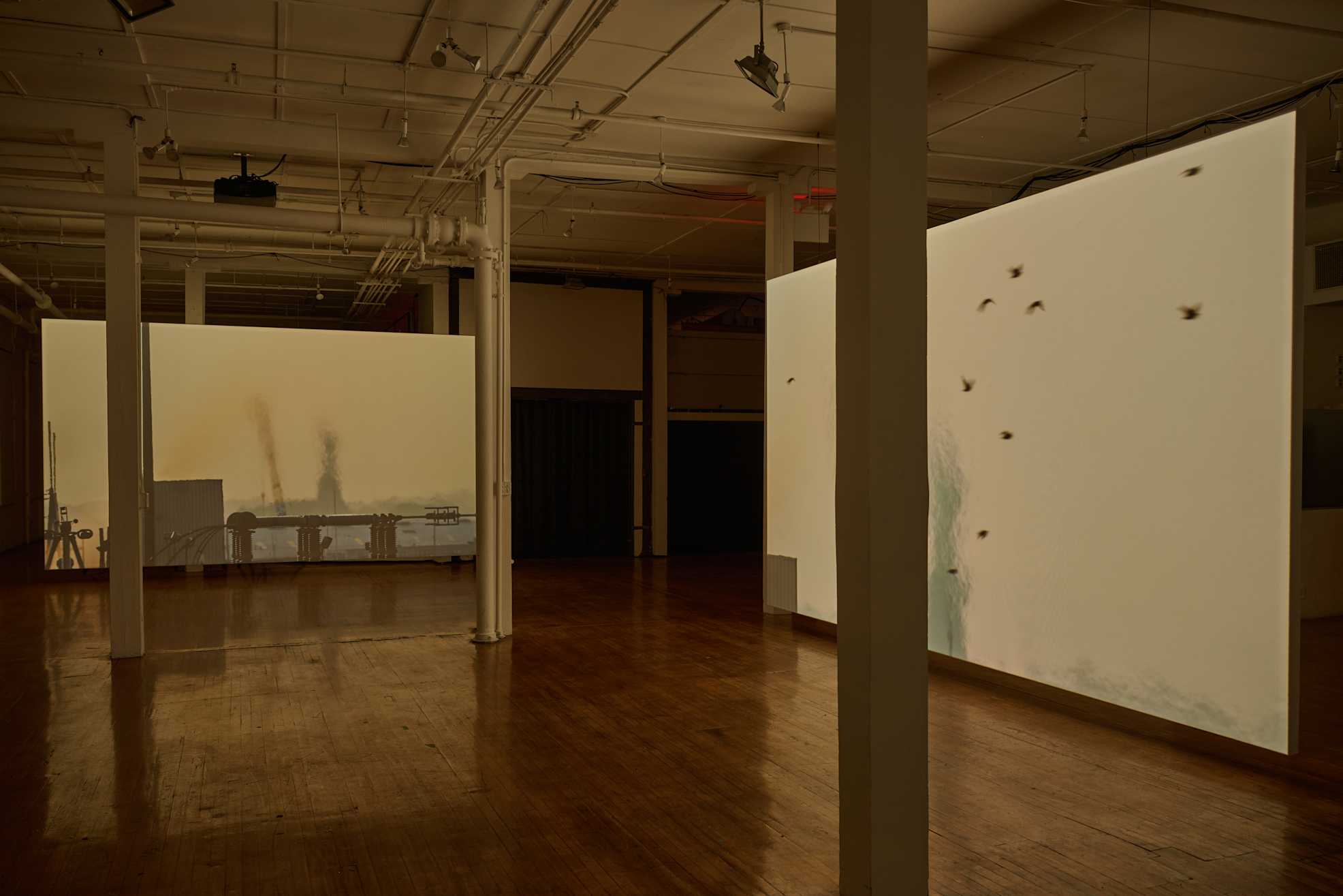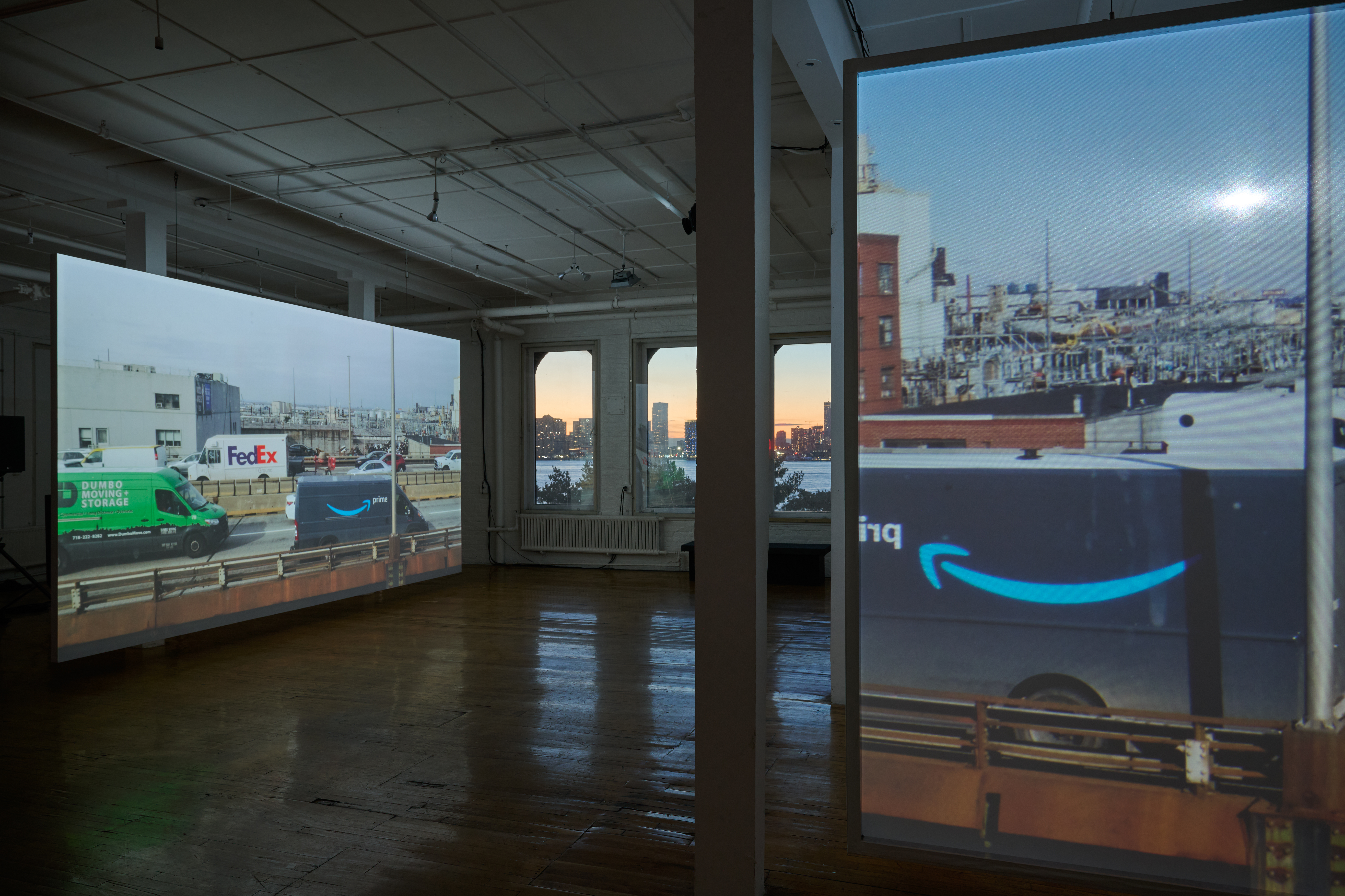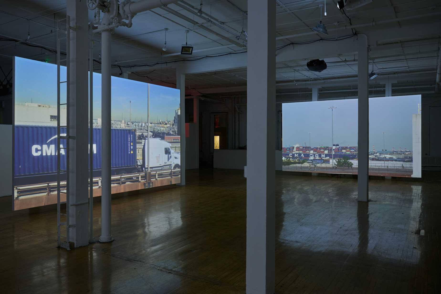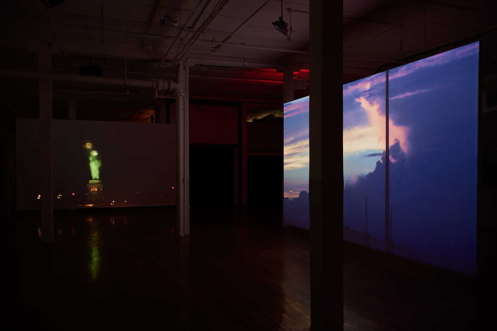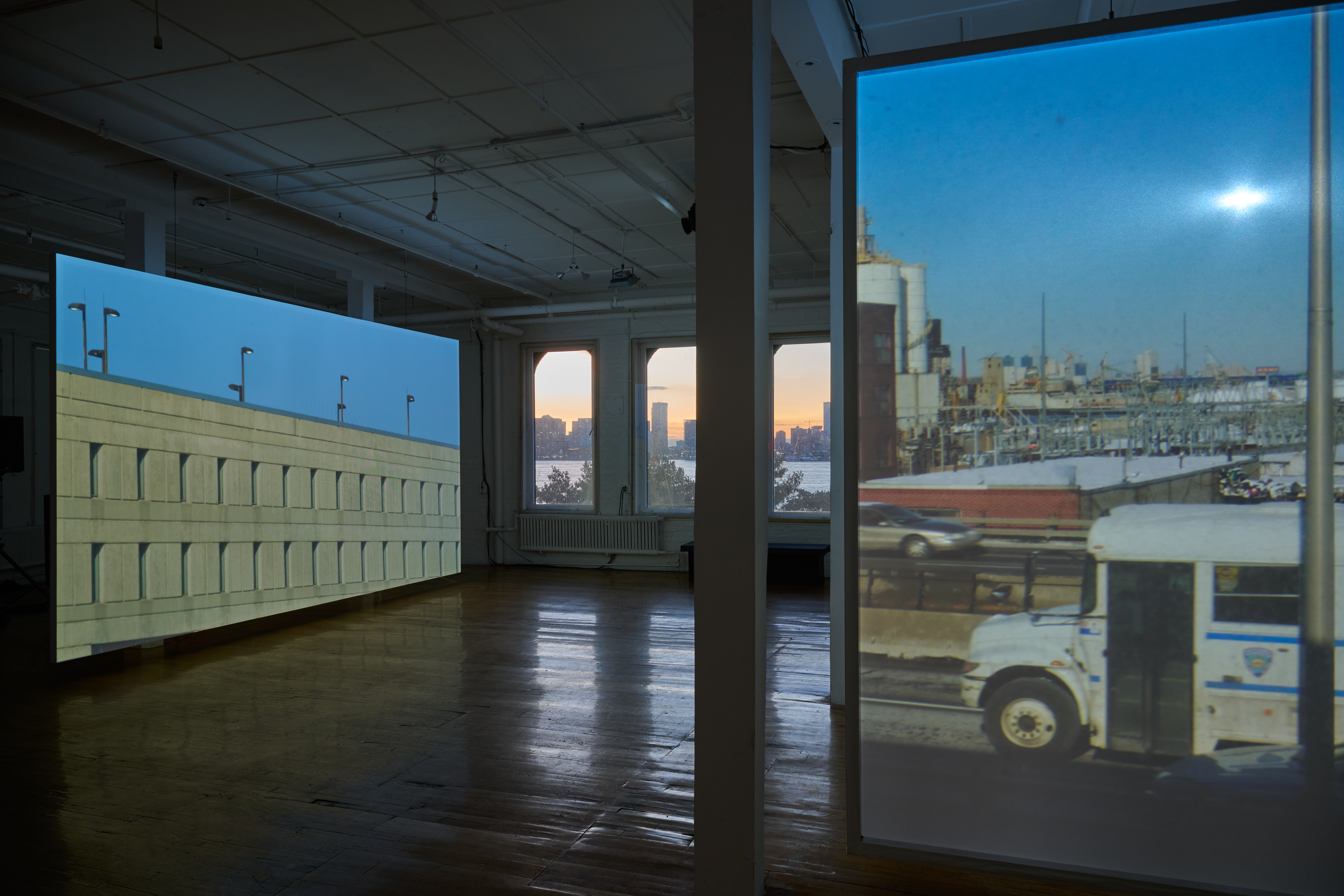 The installation represents the first iteration of a project the artist has been developing since 2018. Following a period of over three years of exploratory research, photography, and writing about the view from his Brooklyn studio, Groeneboer took up a daily practice of filming over the subsequent two and a half years. The resulting footage highlights disparate elements of the cityscape that take on unexpected proximities to one another through the artist’s window: the Brooklyn-Queens Expressway; The Metropolitan Detention Center Brooklyn; a recycling plant; an electrical plant; the Port of New York and New Jersey; the Upper New York and Gowanus Bays; and the Statue of Liberty. Attending to the presence of the architectures and systems that often are hidden from daily city life, Selected Views contemplates the ways the built environment variously conceals and reveals interconnections between democracy, global capitalism, the prison-industrial complex, and environmental crises.